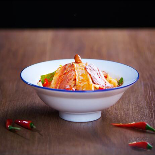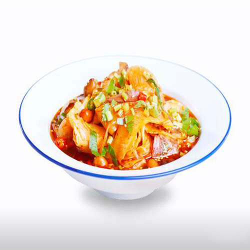 四川名菜,通常以牛頭皮、牛心、牛舌、牛肚、牛肉為主料,配以辣椒油、花椒面等輔料,調(diào)拌而成。色澤紅亮,質(zhì)地軟嫩,口味麻辣濃香。觀之青紅碧綠,紅油重彩,顏色適亮;入口軟糯爽滑,脆筋柔糜、細(xì)嫩化渣。