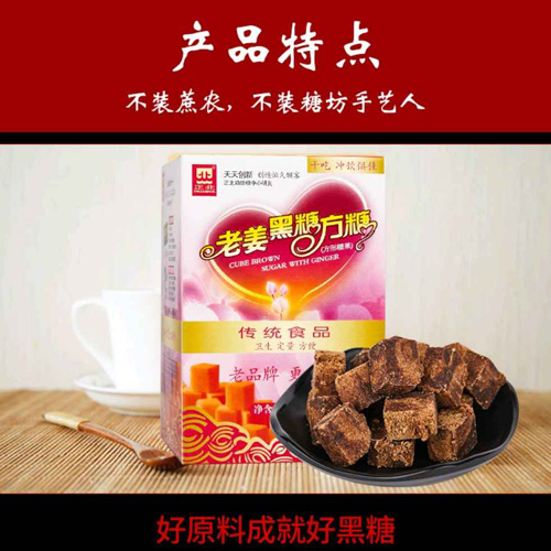 黑 糖:選用傳統(tǒng)工藝精煉而成的黑糖,含有豐富的微量元素,如鈣、鐵、鎂、葉酸等,具有補(bǔ)中益氣、緩中化食、健脾暖胃之功效,還具有止痛、行血、活血散寒及改善動脈硬化的作用。