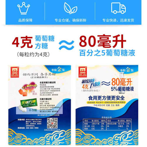 ①單粒獨(dú)立包裝 定量 衛(wèi)生 攜帶方便②使用主料為100%食用級(jí)葡萄糖 天然更健康③4g葡萄糖方糖≈80ml 5%的葡萄糖注射液④葡萄糖食用比肌注、比輸液更安全⑤專(zhuān)利生產(chǎn)線制造,全程潔凈化、無(wú)菌化⑥60年專(zhuān)業(yè)制糖歷史,中國(guó)方糖第一品牌 功能糖專(zhuān)家 堅(jiān)實(shí)的品牌后盾