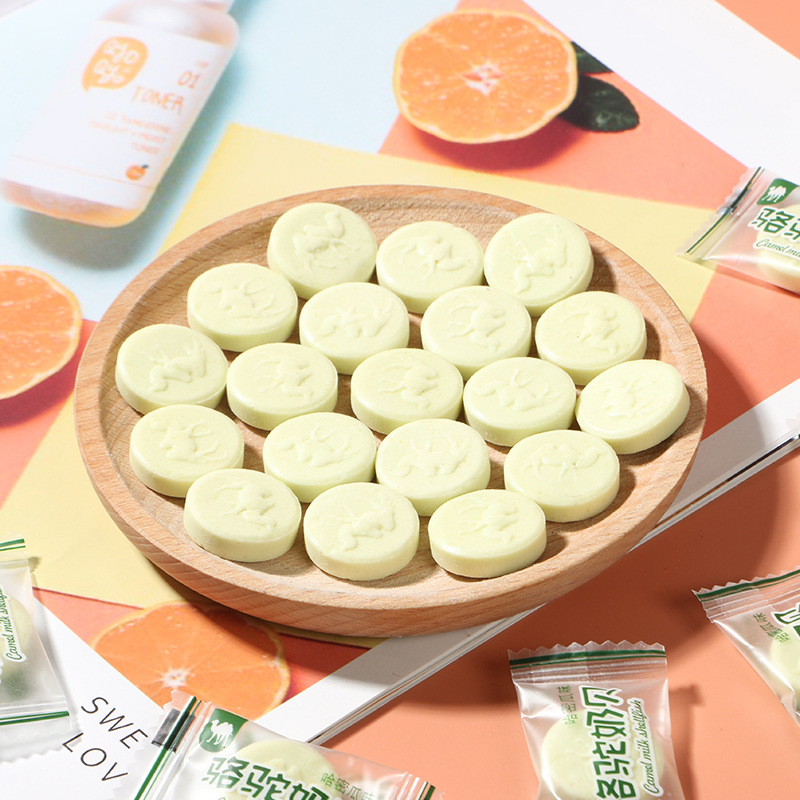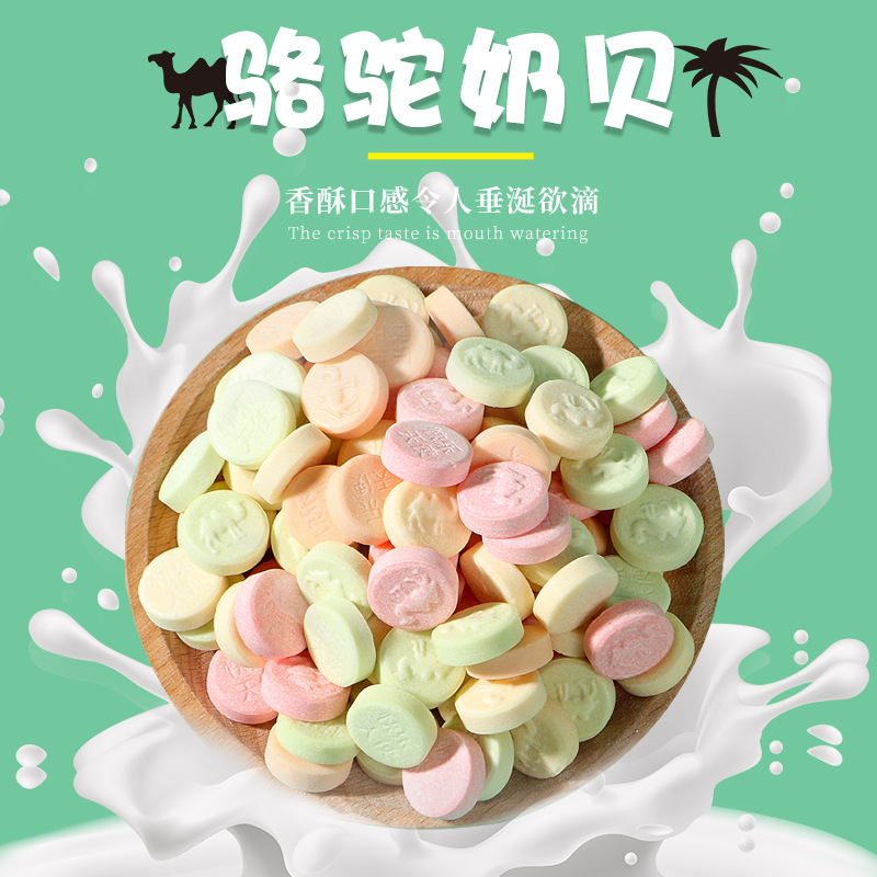 堅(jiān)實(shí)型兒童休閑零食干吃奶片糖源頭工廠 散裝駱駝奶貝500g生產(chǎn)基地