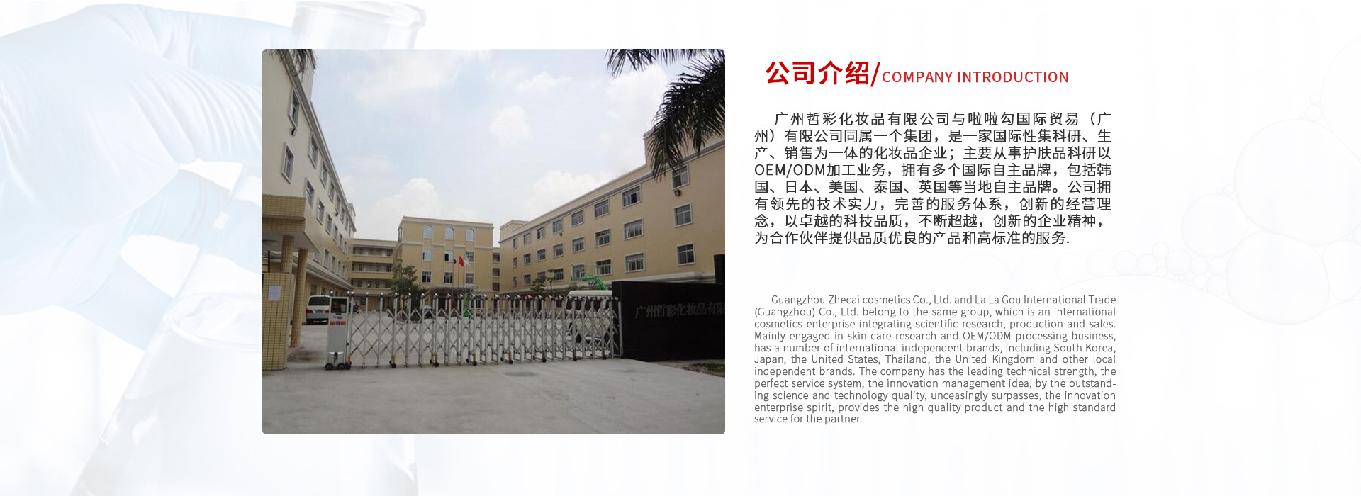 廣州哲彩化妝品有限公司是一家國際性集科研、生產(chǎn)、銷售為一體的化妝品企業(yè);主要從事護膚品科研以及OEM/ODM加工業(yè)務,擁有多個國際自主品牌,包括韓國、日本、美國、泰國、英國等當?shù)刈灾髌放啤9緭碛蓄I先的技術實力,完善的服務體系,創(chuàng)新的經(jīng)營理念,以卓越的科技品質(zhì),不斷超越,創(chuàng)新的企業(yè)精神,為合作伙伴提供品質(zhì)優(yōu)良的產(chǎn)品和高標準的服務.