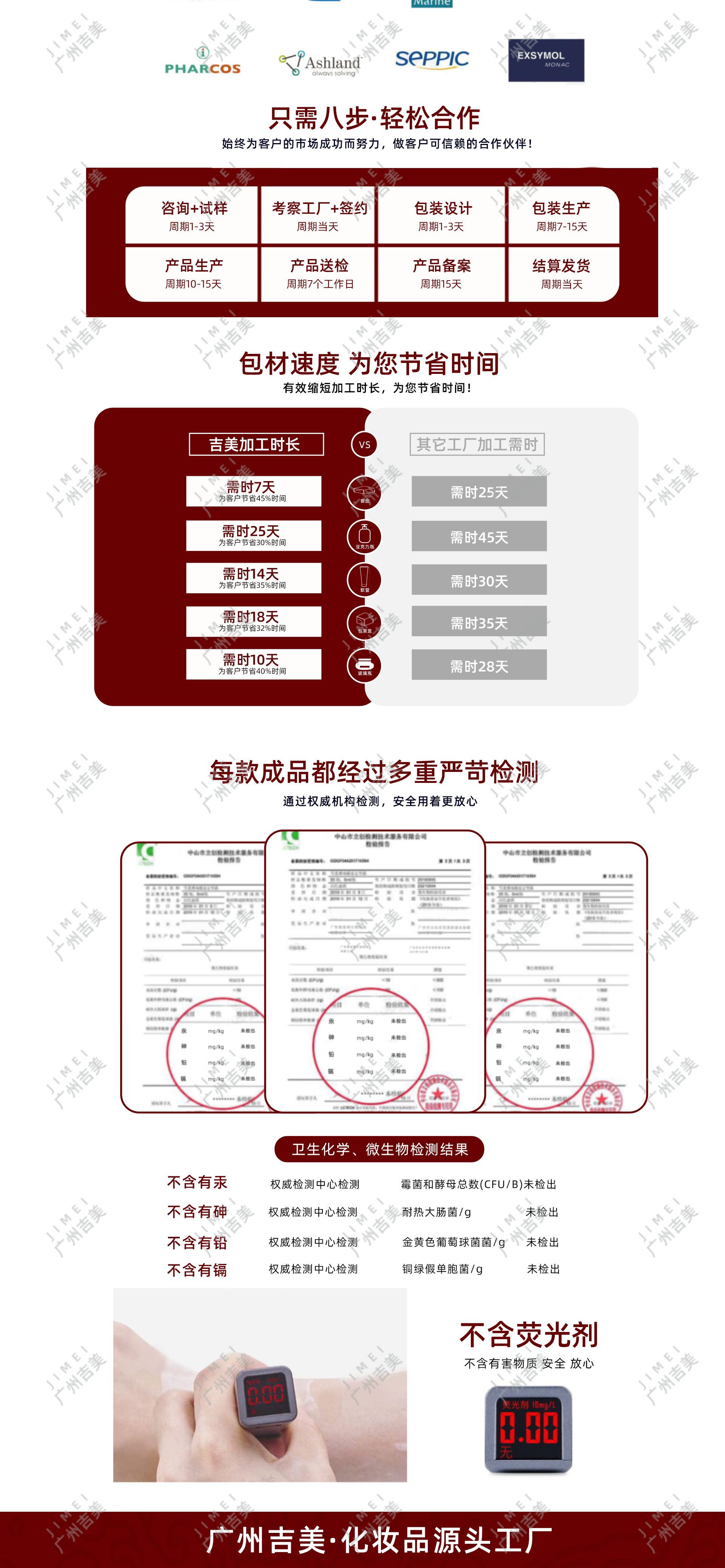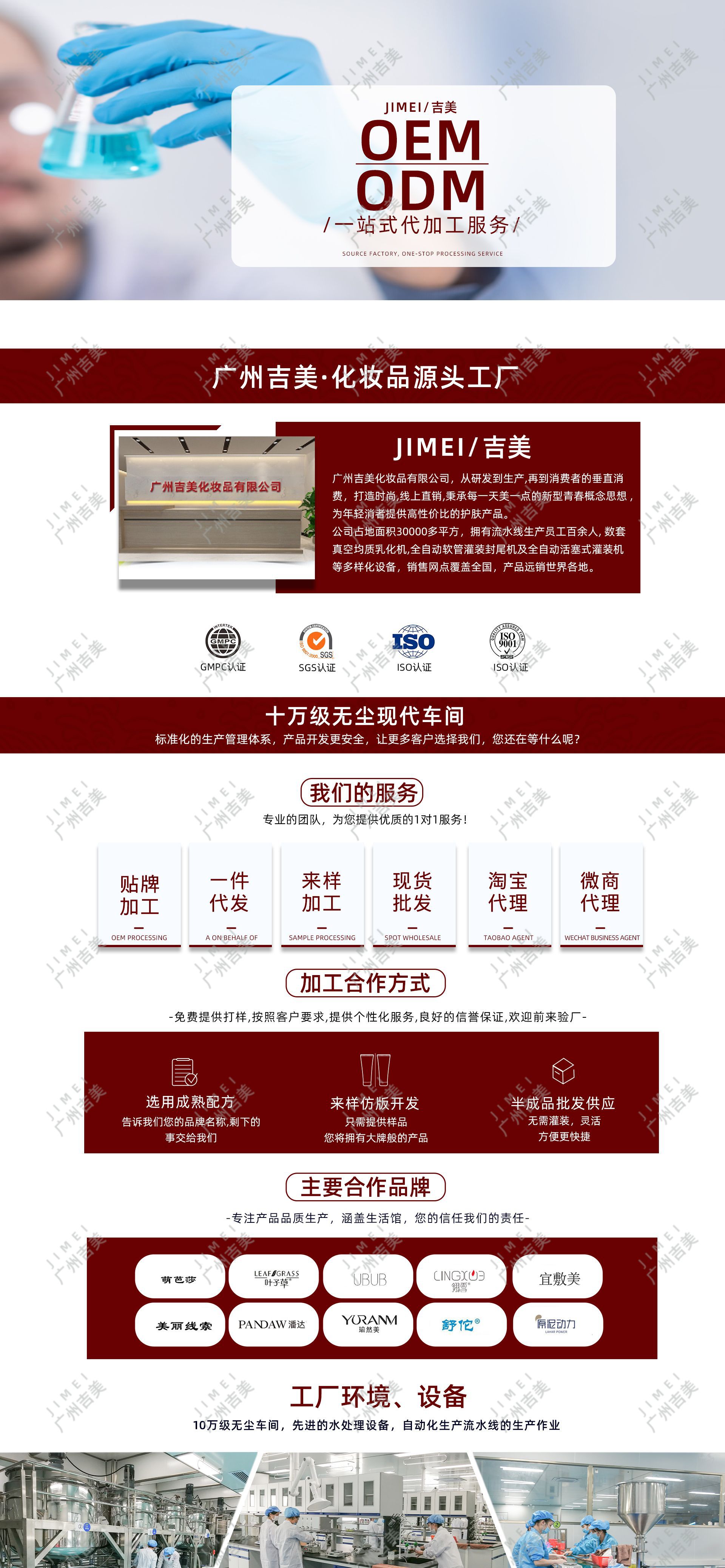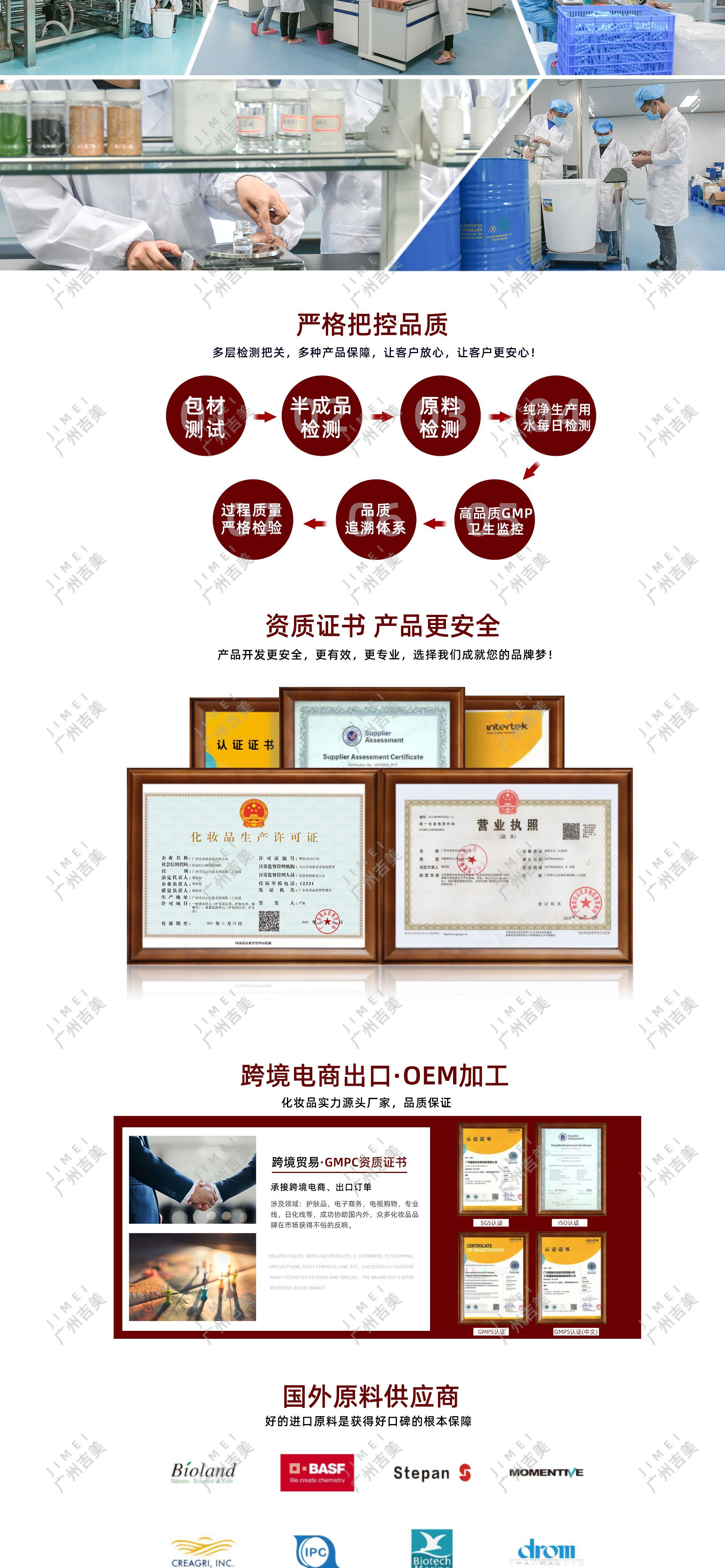廣州吉美化妝品有限公司創(chuàng)立于2020年1月,坐落于廣州市嘉禾望崗,占地約20000平米,是一家專業(yè)從事研究開發(fā),生產經營化妝品OEM加工,化妝品品牌設計和生物、化學及皮膚醫(yī)學深入研究的研發(fā)生產型企業(yè)。公司自成立至今,一貫秉承“ 質量至上”的理念,始終致力于為 客戶提供最新最好的產品,不斷開拓進取,公司一直遵循以客戶導向為原則,滿足不通層次客戶的需求,為其提供針對性的產品和服務。