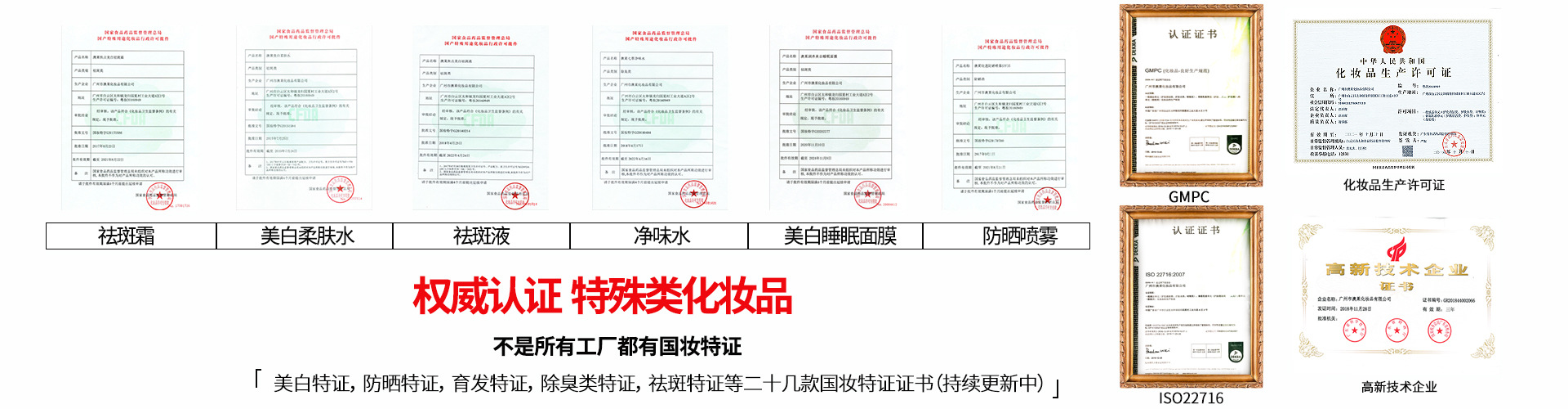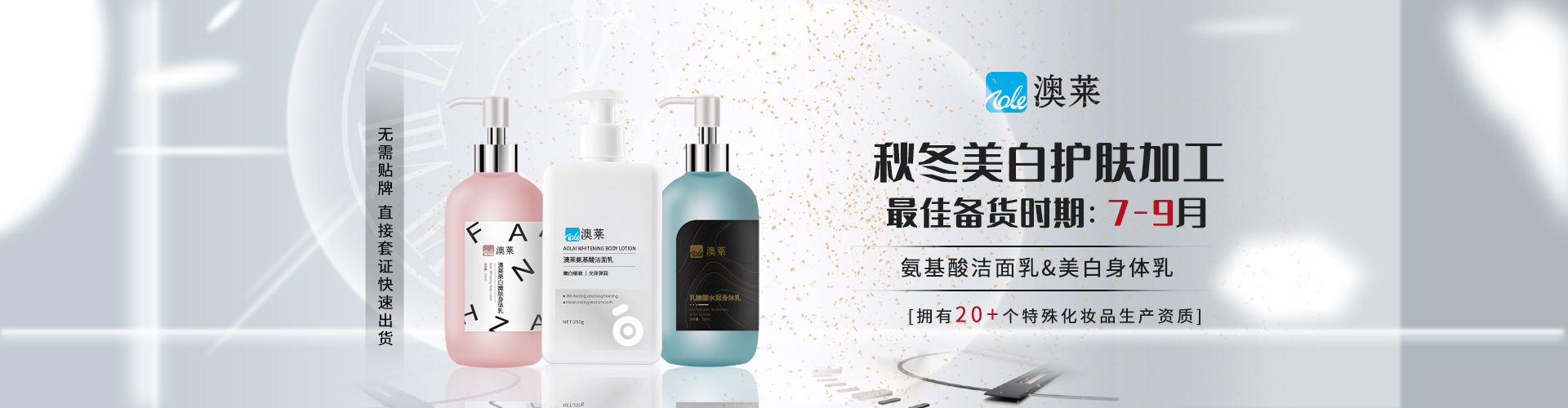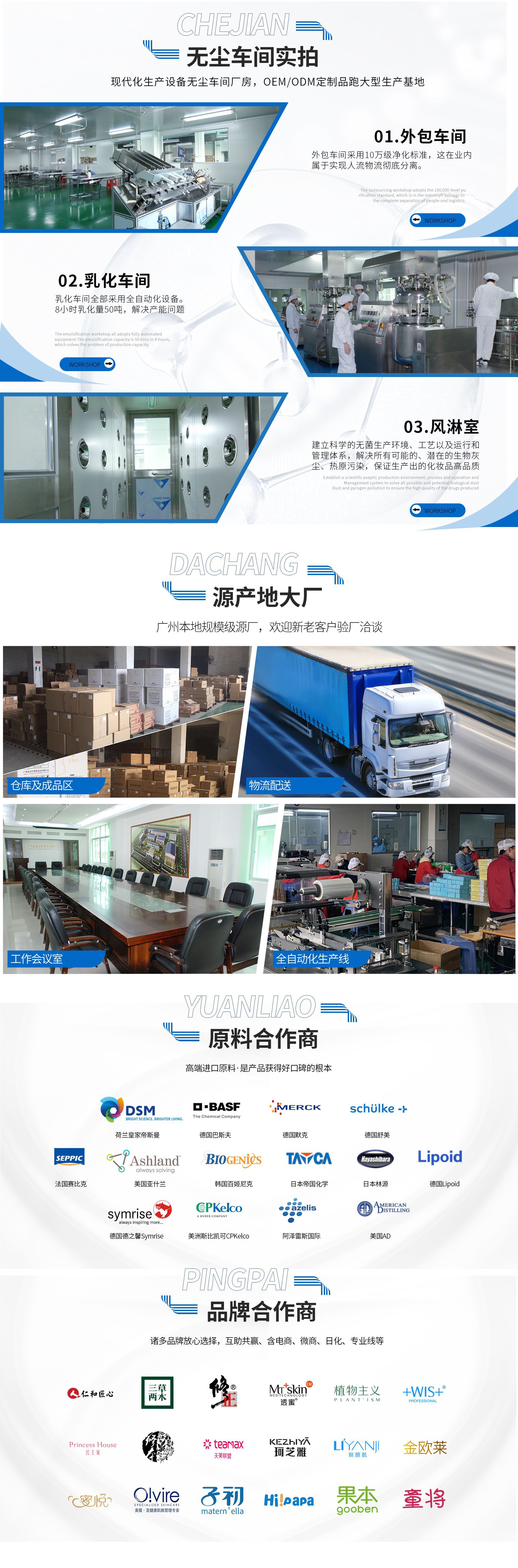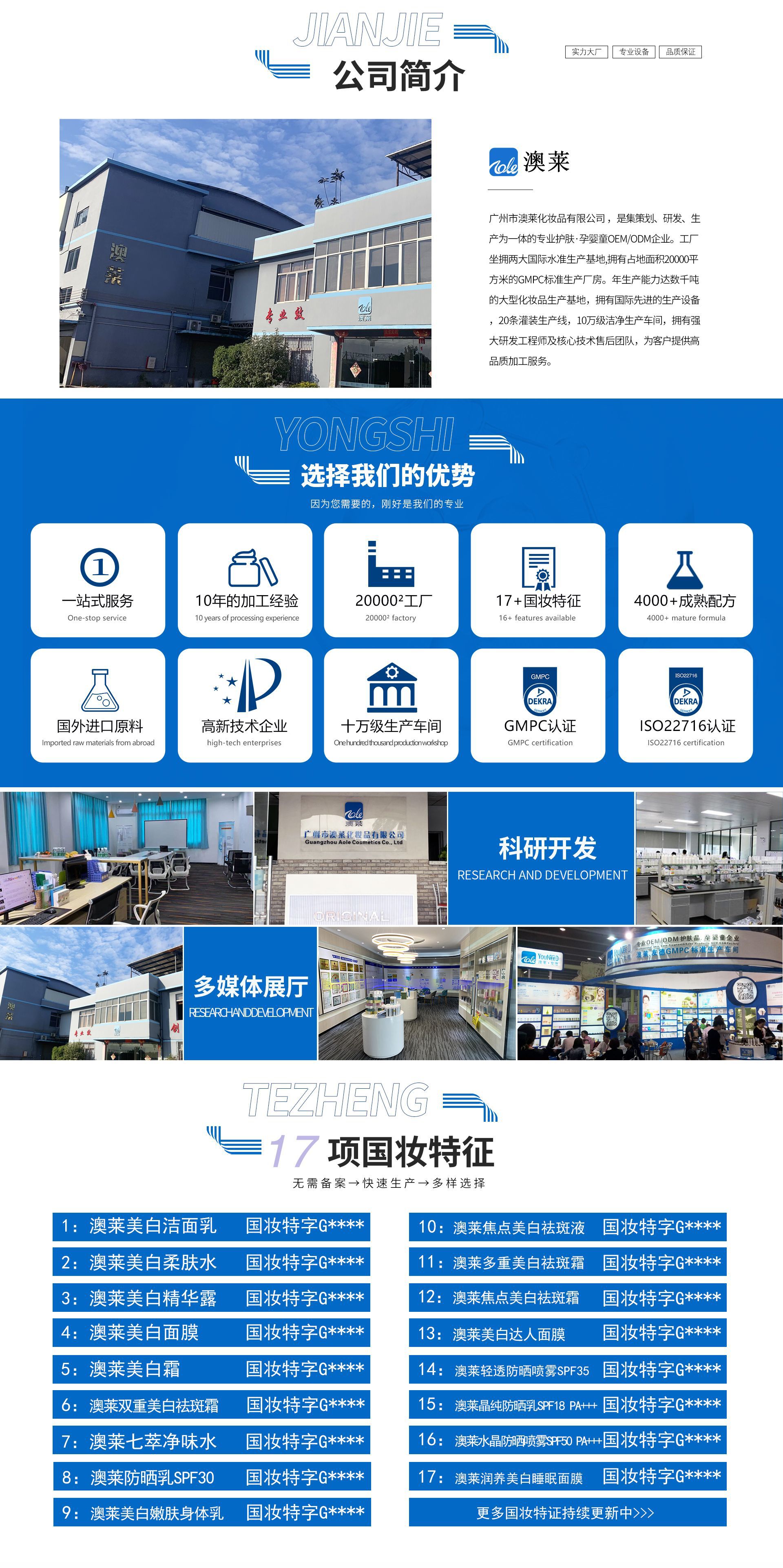 廣州市澳萊化妝品有限公司──專注于護(hù)膚領(lǐng)域的化妝品OEM/ODM專業(yè)制造企業(yè),集產(chǎn)品技術(shù)研發(fā)、加工生產(chǎn)、營(yíng)銷推廣于一體,產(chǎn)品涉及基礎(chǔ)護(hù)膚類、二元噴霧類、美白祛斑類、隔離防曬類、祛痘抗敏修護(hù)類。 軟件方面:已獲得歐盟( ISO22716 )和美國(guó)(GMPC )的雙重認(rèn)證,以及國(guó)家高新技術(shù)企業(yè)證書;并擁有多名資深研發(fā)工程師,開(kāi)發(fā)人員及強(qiáng)大的銷售服務(wù)團(tuán)隊(duì)。累計(jì)沉淀多達(dá)4000多個(gè)成熟配方,52項(xiàng)發(fā)明專利和17個(gè)特證。 硬件方面:工廠擁有12000平方米的GMPC標(biāo)準(zhǔn)生產(chǎn)廠房,以及配套的相關(guān)乳化設(shè)備,二級(jí)反滲透純水裝置,10萬(wàn)級(jí)潔凈生產(chǎn)車間,高效空氣凈化中央空調(diào)系統(tǒng),水劑類、膏霜乳液類、散粉類、洗滌類生產(chǎn)灌裝車間,面貼膜包裝生產(chǎn)線、二元包裝灌裝全自動(dòng)設(shè)備等。按國(guó)家環(huán)保要求安裝一級(jí)污水處理裝置??茖W(xué)的管理及健全規(guī)范的質(zhì)量體系,為客戶提供高品質(zhì)化妝品加工服務(wù)。