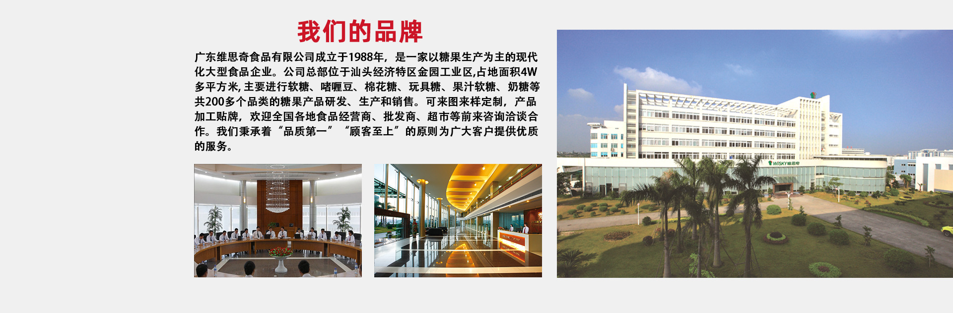 廣東維思奇食品有限公司成立于1988年,是一家以糖果生產(chǎn)為主的現(xiàn)代化大型食品企業(yè)。公司總部位于汕頭經(jīng)濟(jì)特區(qū)金園工業(yè)區(qū),占地面積40000多平方米, 主要進(jìn)行軟糖、啫喱豆、棉花糖、玩具糖、果汁軟糖、奶糖等共200多個(gè)品類的糖果產(chǎn)品研發(fā)、生產(chǎn)和銷售。