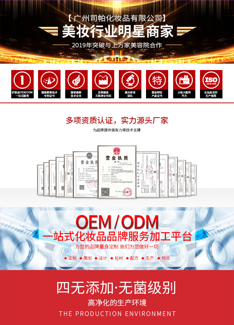 廣州司帕化妝品有限公司是一家集優(yōu)質(zhì)化妝品研發(fā),生產(chǎn),銷售,服務(wù)為一體的化妝品公司。專業(yè)生產(chǎn)加工的公司,擁有完整、科學(xué)的質(zhì)量管理體系。廣州司帕化妝品有限公司以誠信、實力和產(chǎn)品質(zhì)量獲得業(yè)界的認(rèn)可。歡迎各界朋友蒞臨參觀、指導(dǎo)和業(yè)務(wù)洽談。