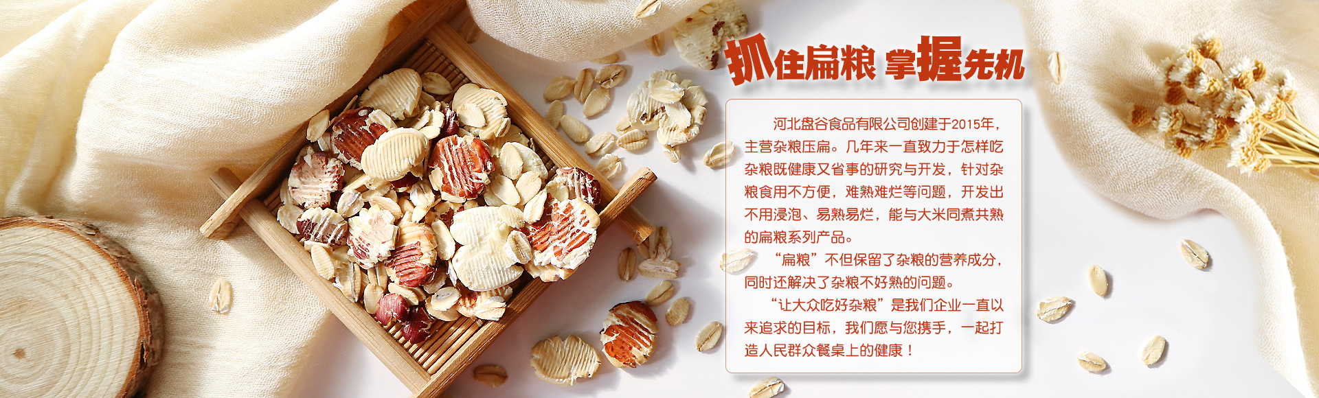 河北盤谷食品有限公司創(chuàng)建于2015年,主營壓扁雜糧。幾年來一直致力于雜糧健康食用方法的研究與開發(fā),針對雜糧食用不方便、難煮難爛等問題,開發(fā)出無需浸泡、易熟易爛,可與大米同煮共熟的扁糧系列產(chǎn)品,既能很大限度地保留雜糧的各種營養(yǎng)成分,又解決了雜糧食用難的問題。 “讓雜糧好熟易爛”是我們企業(yè)一直以來追求的目標,我們愿與您攜手,一起打造大眾餐桌上的健康主食!