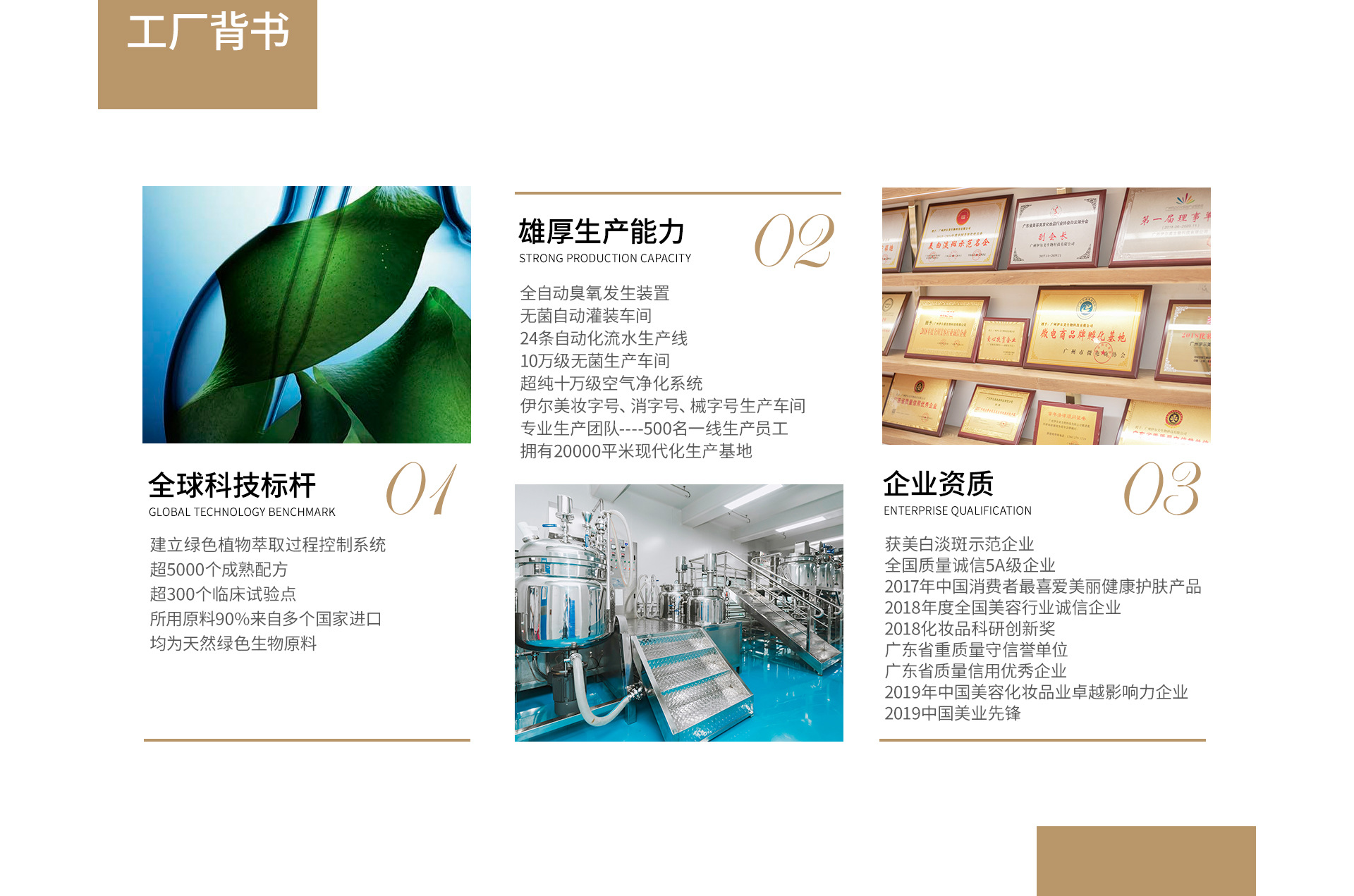 公司簡(jiǎn)介 伊爾美集團(tuán)是一家集化妝品專業(yè)策劃、研發(fā)、生產(chǎn)為一體的綜合性國(guó)際化大型企業(yè),擁有中國(guó)完整,豐富的個(gè)人護(hù)理品產(chǎn)品品類,一直堅(jiān)持以科技為依托,以品質(zhì)為核心,以時(shí)尚為靈魂來服務(wù)客戶。我司在數(shù)百家服務(wù)品牌中,不乏各大領(lǐng)域眾多耳熟能詳?shù)闹放?。且英?guó)利物浦海洋生物科技有限公司(一個(gè)在引領(lǐng)海外技術(shù)潮流的英國(guó)),伊爾美生物個(gè)人護(hù)理品聯(lián)合開發(fā)中心(一個(gè)在擁有巨大市場(chǎng)需求的中國(guó)大陸),先后成立。兩個(gè)開發(fā)中心遙相呼應(yīng),充分、深刻、精準(zhǔn)地把握著海內(nèi)外美妝風(fēng)向的脈搏。 伊爾美集團(tuán)廣州分公司 廣州伊爾美生物科技有限公司廠房占地總面積2萬平方米,生產(chǎn)車間按照高潔凈凈化生產(chǎn)車間國(guó)際化生產(chǎn)藥品的標(biāo)準(zhǔn)構(gòu)建,且率先通過ISO9001:2008國(guó)際質(zhì)量管理體系、歐盟GMPC、ISO22716化妝品良好生產(chǎn)規(guī)范等認(rèn)證。配合卓越的生產(chǎn)管理,15條流水線?!皟蓚€(gè)研發(fā)中心”的鮮明格局在中國(guó)美妝OEM/ODM領(lǐng)域中別樹一幟