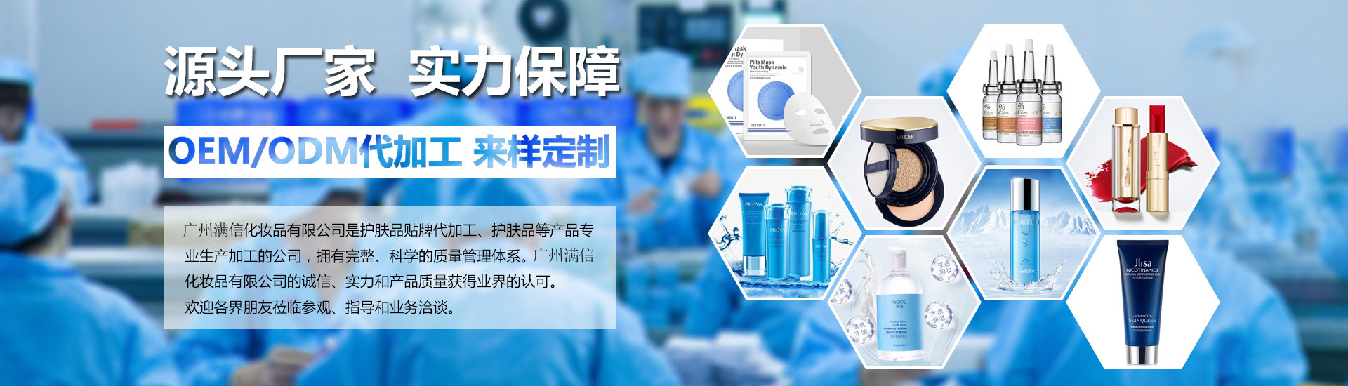 廣州滿信化妝品有限公司成立于2014年,坐落再廣州白云區(qū),工廠主要生產(chǎn)各類護膚,洗滌,美容院線專業(yè)線產(chǎn)品。