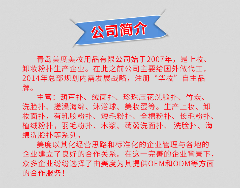 青島美度美妝用品有限公司始創(chuàng)立于2007年,是上妝、卸妝粉撲生產(chǎn)企業(yè)。在此之前公司主要給國(guó)外做代工,2014年總部規(guī)劃內(nèi)需發(fā)展戰(zhàn)略,成立注冊(cè)“華妝”自主品牌,主要拓展國(guó)內(nèi)市場(chǎng)業(yè)務(wù)。 工廠位于青島膠州灣工業(yè)園,緊靠204國(guó)道及同三、濟(jì)青、膠州灣高速公路,交通物流快捷、產(chǎn)品采購(gòu)方便,至國(guó)內(nèi)各大中城市均有直達(dá)快速物流;距離青島機(jī)場(chǎng)只有20分鐘路程,距離青島港只有30分鐘路程。 目前廠房面積4000平米,固定員工50人,工廠下設(shè)研發(fā)部、采購(gòu)部、生產(chǎn)部、包裝部,以及銷(xiāo)售部。寬敞的辦公場(chǎng)地,整齊機(jī)械化的生產(chǎn)車(chē)間,研發(fā)設(shè)計(jì)團(tuán)隊(duì),高素質(zhì)的銷(xiāo)售,為企業(yè)長(zhǎng)足發(fā)展奠定良好的基礎(chǔ)。在企業(yè)的經(jīng)營(yíng)中,美度產(chǎn)品無(wú)論是研發(fā)還是生產(chǎn),均采用好的生產(chǎn)設(shè)備和制造技術(shù),產(chǎn)品質(zhì)量達(dá)到了標(biāo)準(zhǔn)水平!