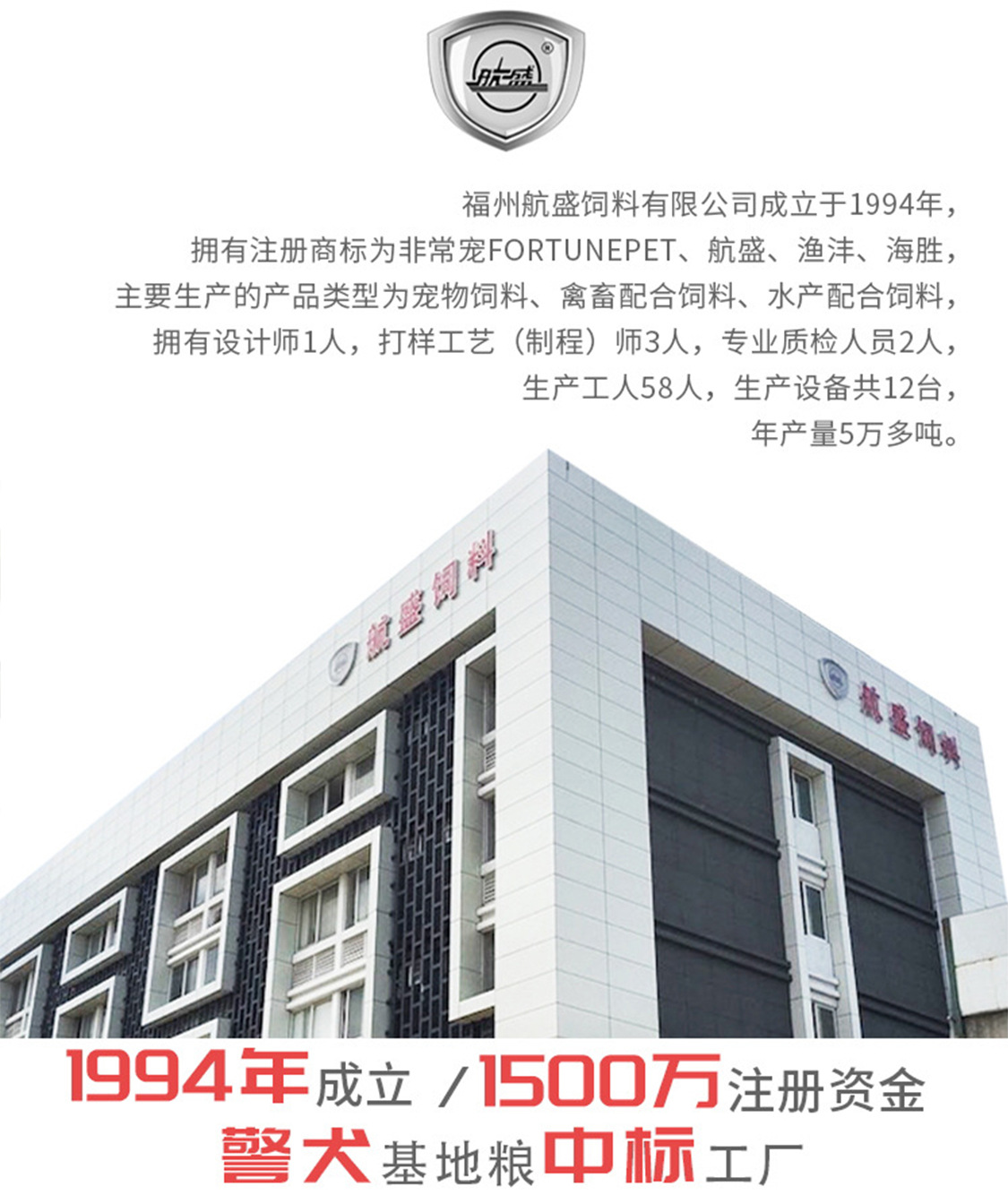 1994年,福州航盛飼料成立。警犬糧 供應(yīng)商。 膨化線 2 條,顆粒線 2 條。日常膨化糧 100 噸,顆粒料 40 噸。 員工 140 多名,車間 7000 多平米。