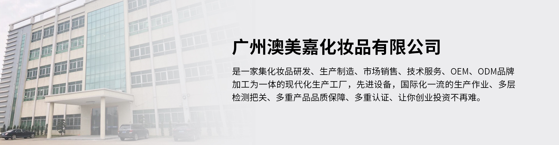 廣州澳美嘉實(shí)業(yè)有限公司是美妝、護(hù)膚、彩妝、身體洗護(hù)等產(chǎn)品專業(yè)生產(chǎn)加工的公司,擁有完整、科學(xué)的質(zhì)量管理體系。廣州澳美嘉實(shí)業(yè)有限公司的誠信、實(shí)力和產(chǎn)品質(zhì)量獲得業(yè)界的認(rèn)可。歡迎各界朋友蒞臨參觀、指導(dǎo)和業(yè)務(wù)洽談。