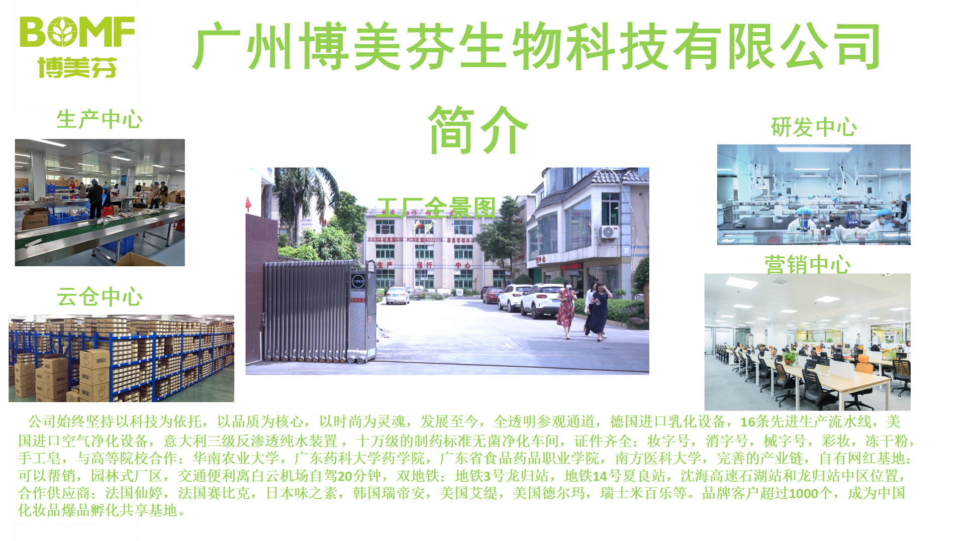 廣州博美芬生物科技有限公司坐落于廣州市白云區(qū)太和鎮(zhèn)夏良村夏良路321號(hào),總面積達(dá)20000平方米,是一家集產(chǎn)品自主研發(fā)、生產(chǎn)銷售、營(yíng)銷策劃、動(dòng)銷賦能為一體的多元化美妝創(chuàng)新企業(yè)。公司致力于打造新 - -代美妝品牌孵化平臺(tái),從靈感到整套解決方案,都有一支經(jīng)驗(yàn)豐富、能力出眾的專業(yè)研發(fā)團(tuán)隊(duì)負(fù)責(zé)。公 司與中山大學(xué)、華南理工大學(xué)、華南農(nóng)業(yè)大學(xué)、廣 東省食品藥品職業(yè)學(xué)院共建產(chǎn)研轉(zhuǎn)換中心,向市場(chǎng)推出 了數(shù)款原創(chuàng)產(chǎn)品,引爆市場(chǎng)潮流,是名 副其實(shí)的美妝 品牌孵化智造基地。企業(yè)理念 博愛、美麗、芬芳g 是博美芬的核心含意,「誠(chéng)實(shí)、 協(xié)作、精研、匠心J是博美芬的核心價(jià)值觀;博美芬人正以創(chuàng)新研發(fā)、用心智造、砥礪奮進(jìn),誠(chéng)信服務(wù)的態(tài)度,與您并肩攜手,在廣闊的美妝市場(chǎng)奮勇向前。打造民族品牌,弘揚(yáng)美麗使命,成為民族美妝領(lǐng)導(dǎo)品牌j的偉大愿景不懈奮斗!讓「美麗中國(guó)夢(mèng)g從博美芬啟航!