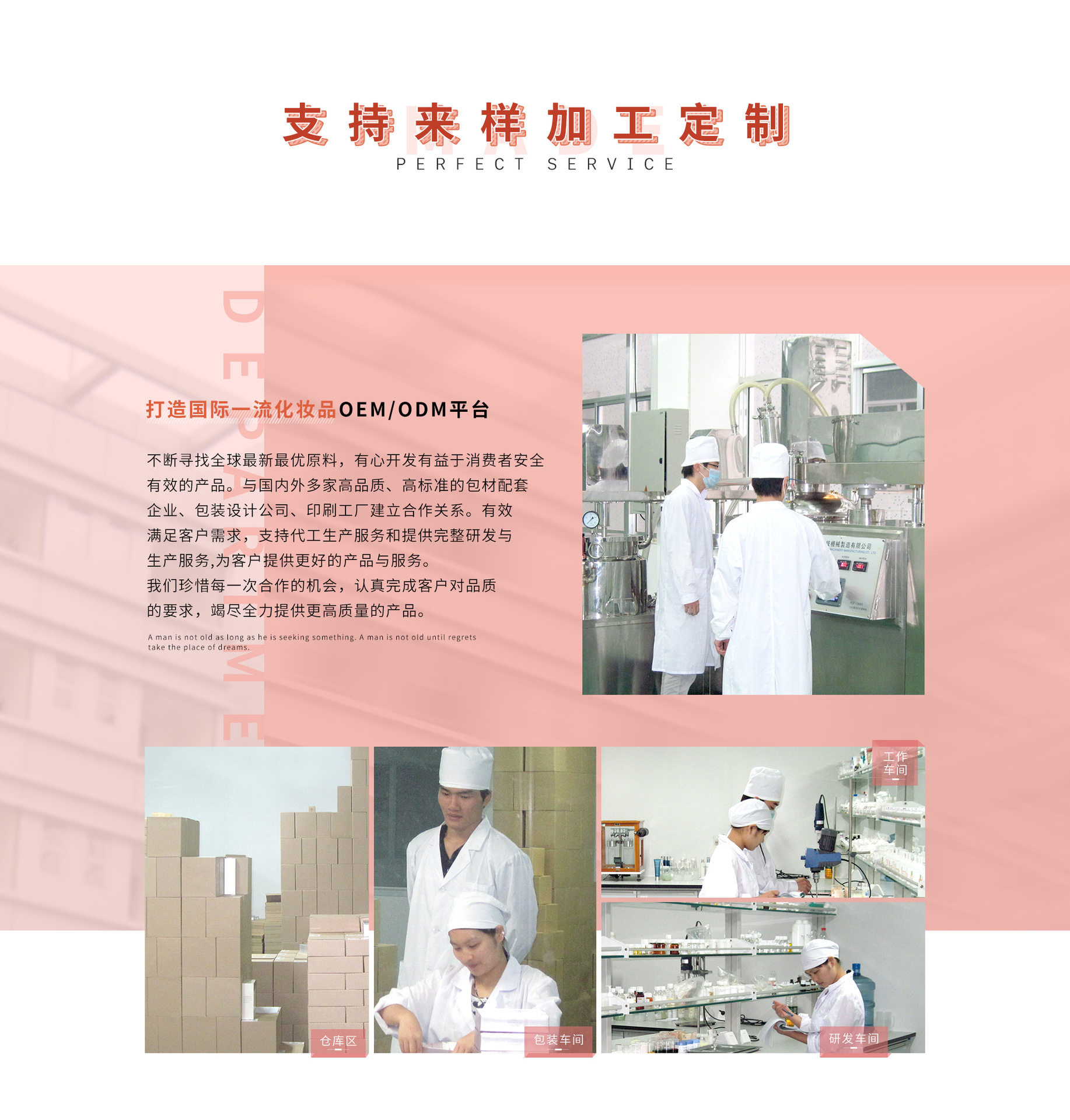 汕頭市唯美化妝品有限公司是一家具有國(guó)際化水準(zhǔn)的專業(yè)化妝品OEM/ODM研發(fā)生產(chǎn)基地,其前身在業(yè)內(nèi)已有二十余年歐美、東南亞及中東出口經(jīng)驗(yàn),以嚴(yán)謹(jǐn)?shù)膶I(yè)和優(yōu)質(zhì)的品質(zhì)享譽(yù)業(yè)內(nèi)。工廠建設(shè)嚴(yán)格參照制藥GMP生產(chǎn)標(biāo)準(zhǔn),一次性通過(guò)ISO9001國(guó)際質(zhì)量體系認(rèn)證,并嚴(yán)格按照ISO9001國(guó)際質(zhì)量體系認(rèn)證規(guī)范建立了產(chǎn)品品質(zhì)保證體系。采用全員全過(guò)程質(zhì)量管理,通過(guò)高標(biāo)準(zhǔn),嚴(yán)要求的硬件及軟件的支撐,打造在行業(yè)中的良好口碑。