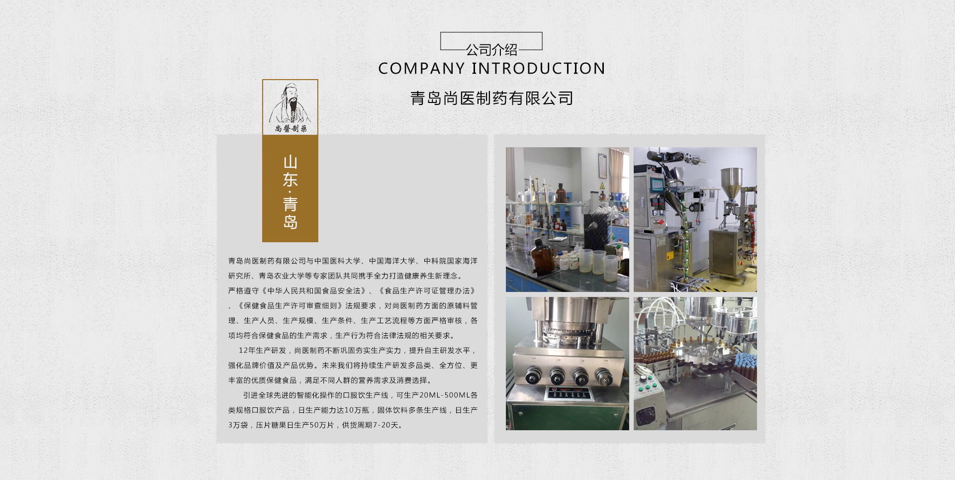 青島尚醫(yī)制藥有限公司,坐落于青島美麗的養(yǎng)生圣地----嶗山腳下, 是山東青島市一家有GMP認證、ISO9001質(zhì)量管理認證和ISO22000食品安全認證的研發(fā)、生產(chǎn)型企業(yè),是專業(yè)的醫(yī)用食品、保健食品、營養(yǎng)食品生產(chǎn)商,擁有國家級標準十萬級GMP凈化車間,SC/GMP雙證齊全,可生產(chǎn)各種規(guī)格片劑、粉劑、膠囊、顆粒、固體飲料、口服液、代用茶等劑型企業(yè)。其中膠囊生產(chǎn)年產(chǎn)量1億粒,壓片5000萬片。 尚醫(yī)制藥與中國醫(yī)科大學、中國海洋大學、中科院國家海洋研究所、青島農(nóng)業(yè)大學專家團隊共同攜手全力打造健康養(yǎng)生新理念。