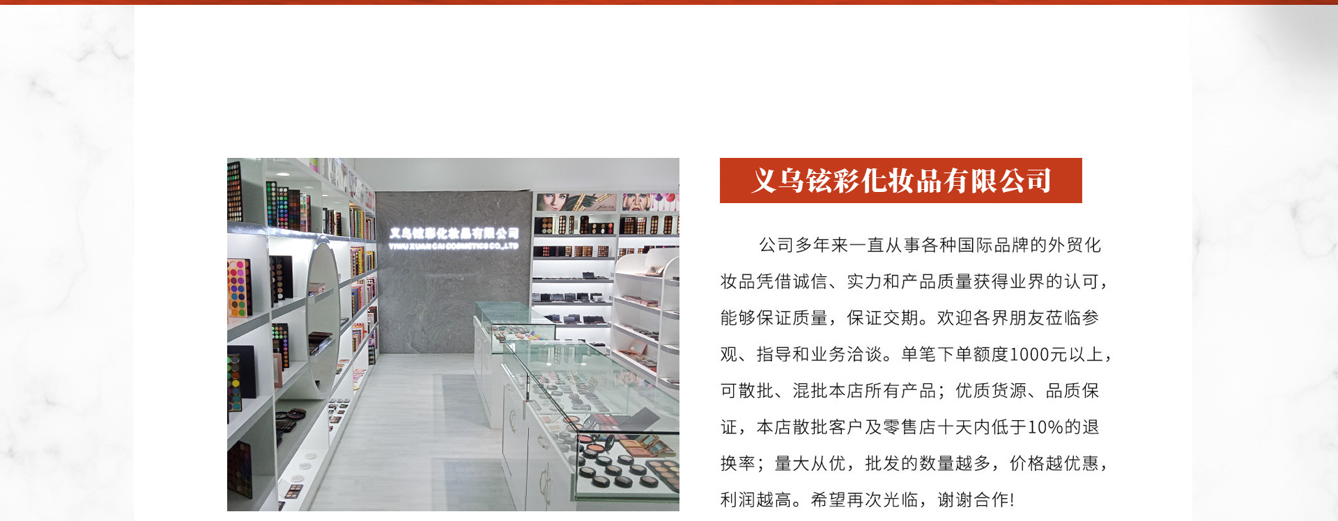 義烏鉉彩化妝品有限公司是一家集產(chǎn)品研發(fā)、生產(chǎn)和網(wǎng)絡(luò)銷售為一體的多元化美妝科研創(chuàng)新公司,公司主營產(chǎn)品有:眼影、遮瑕膏、高光、唇彩、口紅、睫毛膏、眼線液、腮紅、粉底液、化妝刷等。公司產(chǎn)品品種齊全、價(jià)格合理,產(chǎn)品暢銷全球市場,在消費(fèi)者當(dāng)中享有較高的地位,公司與多家零售商和代理商建立了長期穩(wěn)定的合作關(guān)系。 義烏鉉彩化妝品有限公司實(shí)力雄厚,重信用、守合同、保證產(chǎn)品質(zhì)量,以多品種經(jīng)營特色和薄利多銷的原則,贏得了廣大客戶的信任。我們誠心與廣大客戶實(shí)現(xiàn)合作雙贏,產(chǎn)品自產(chǎn)自銷,價(jià)格優(yōu)美,是廣大客戶的信任之選