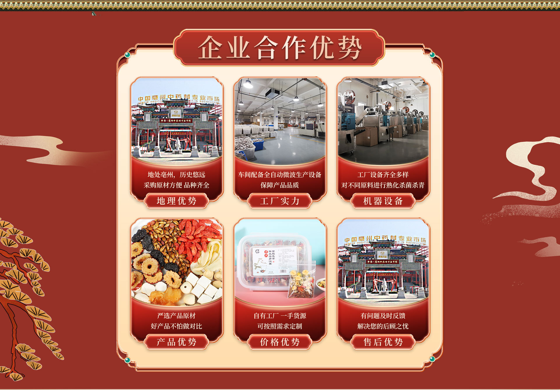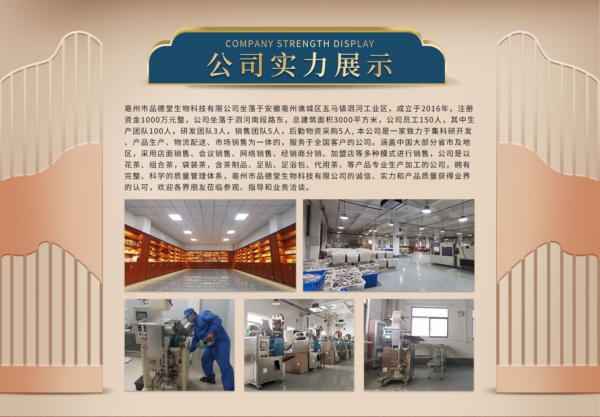 亳州市品德堂生物科技有限公司坐落于安徽亳州譙城區(qū)五馬鎮(zhèn)泗河工業(yè)區(qū),成立于2016年,注冊(cè)資金1000萬元整,公司坐落于泗河南段路東,總建筑面積3000平方米,公司員工150人,其中生產(chǎn)團(tuán)隊(duì)100人,研發(fā)團(tuán)隊(duì)3人,銷售團(tuán)隊(duì)5人,后勤物資采購(gòu)5人, 本公司是一家致力于集科研開發(fā)、產(chǎn)品生產(chǎn)、物流配送、市場(chǎng)銷售為一體的,服務(wù)于全國(guó)客戶的公司。涵蓋中國(guó)大部分省市及地區(qū),采用店面銷售、會(huì)議銷售、網(wǎng)絡(luò)銷售、經(jīng)銷商分銷、加盟店等多種模式進(jìn)行銷售,公司是以花茶、組合茶,袋裝茶,含茶制品、足貼、足浴包、代用茶、等產(chǎn)品專業(yè)生產(chǎn)加工的公司,擁有完整、科學(xué)的質(zhì)量管理體系,亳州市品德堂生物科技有限公司的誠(chéng)信、實(shí)力和產(chǎn)品質(zhì)量獲得業(yè)界的認(rèn)可,歡迎各界朋友蒞臨參觀、指導(dǎo)和業(yè)務(wù)洽談。
