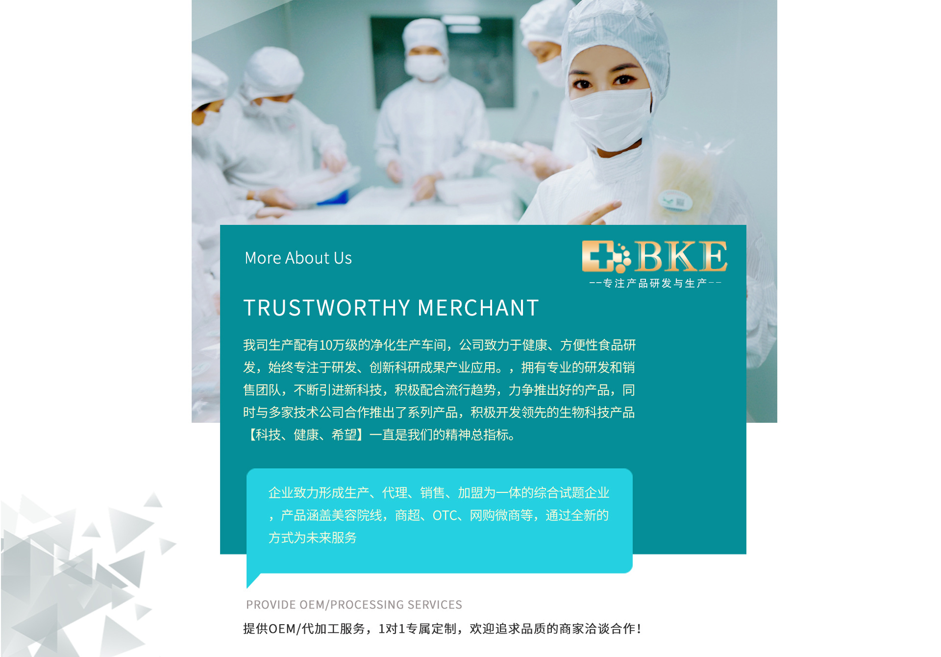 百達(dá)醫(yī)(廣州)生物科技有限公司是專業(yè)食品生產(chǎn)加工的公司,擁有完整、科學(xué)的質(zhì)量管理體系,公司致力于健康、功能性食品研發(fā),始終專注于研發(fā)、創(chuàng)新金額科研成果產(chǎn)業(yè)應(yīng)用,擁有自主的產(chǎn)品研發(fā)團(tuán)隊和產(chǎn)品研發(fā)實驗室,匯集生物科研院所、院校領(lǐng)域的技術(shù)精英,,生產(chǎn)線含概:固體飲料、液體飲料,片劑、粉劑、凍干食品等項目。百達(dá)醫(yī)(廣州)生物科技有限公司的誠信、實力和產(chǎn)品質(zhì)量獲得業(yè)界的認(rèn)可。歡迎各界朋友蒞臨參觀、指導(dǎo)和業(yè)務(wù)洽談。