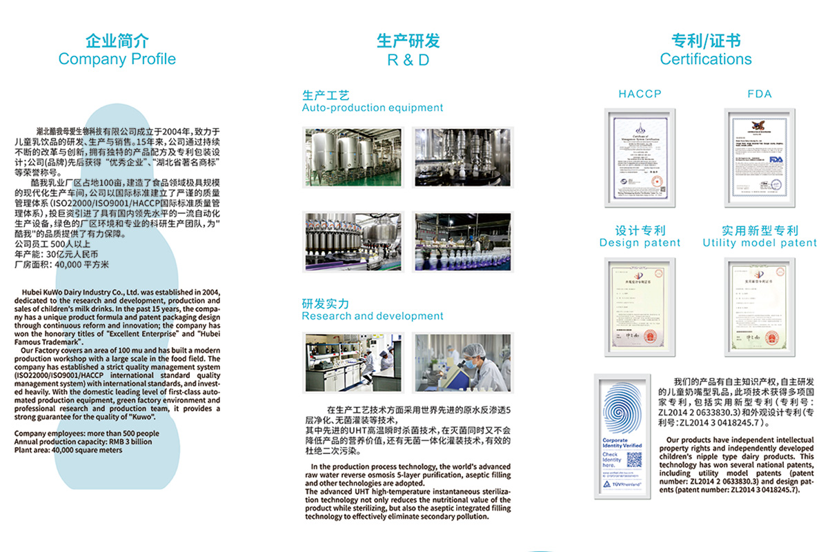 湖北酷我母愛生物科技有限公司以專業(yè)的視角通過十多年在兒童領(lǐng)域的專注,并隨著“酷我”品牌知名度的不斷提升,匯聚了一大批高學(xué)歷具有豐富實(shí)踐經(jīng)驗(yàn)的高素質(zhì)人才,為“酷我”平臺(tái)的發(fā)展壯大貢獻(xiàn)才華,90%以上的“酷我”管理類員工和營銷類員工具有本科以上學(xué)歷。公司以國際標(biāo)準(zhǔn)的要求建立了嚴(yán)謹(jǐn)?shù)馁|(zhì)量管理體系,投巨資引進(jìn)并建造了具有世界領(lǐng)先水平的一流自動(dòng)化生產(chǎn)設(shè)備;一流的綠色工廠,公司生產(chǎn)與辦公環(huán)境的高標(biāo)準(zhǔn)要求,為"酷我"品牌的品質(zhì)提供了有力保障,現(xiàn)生產(chǎn)規(guī)模年產(chǎn)值可達(dá)30億元。