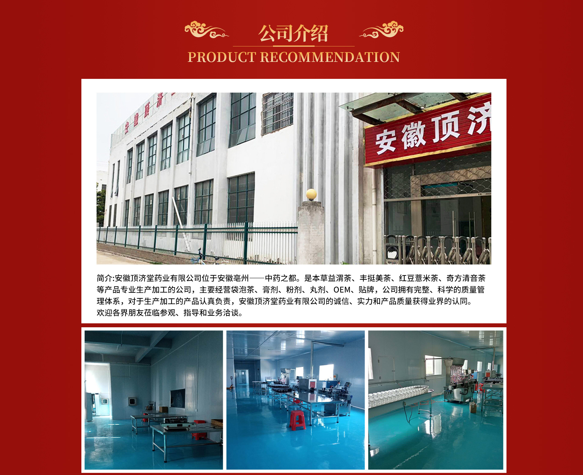 安徽頂濟堂藥業(yè)有限公司是袋泡茶茶、花草茶茶、方便食品、丸劑膏劑等產(chǎn)品專業(yè)生產(chǎn)加工的公司,擁有完整、科學的質量管理體系。安徽頂濟堂藥業(yè)有限公司的誠信、實力和產(chǎn)品質量獲得業(yè)界的認可。歡迎各界朋友蒞臨參觀、指導和業(yè)務洽談。
