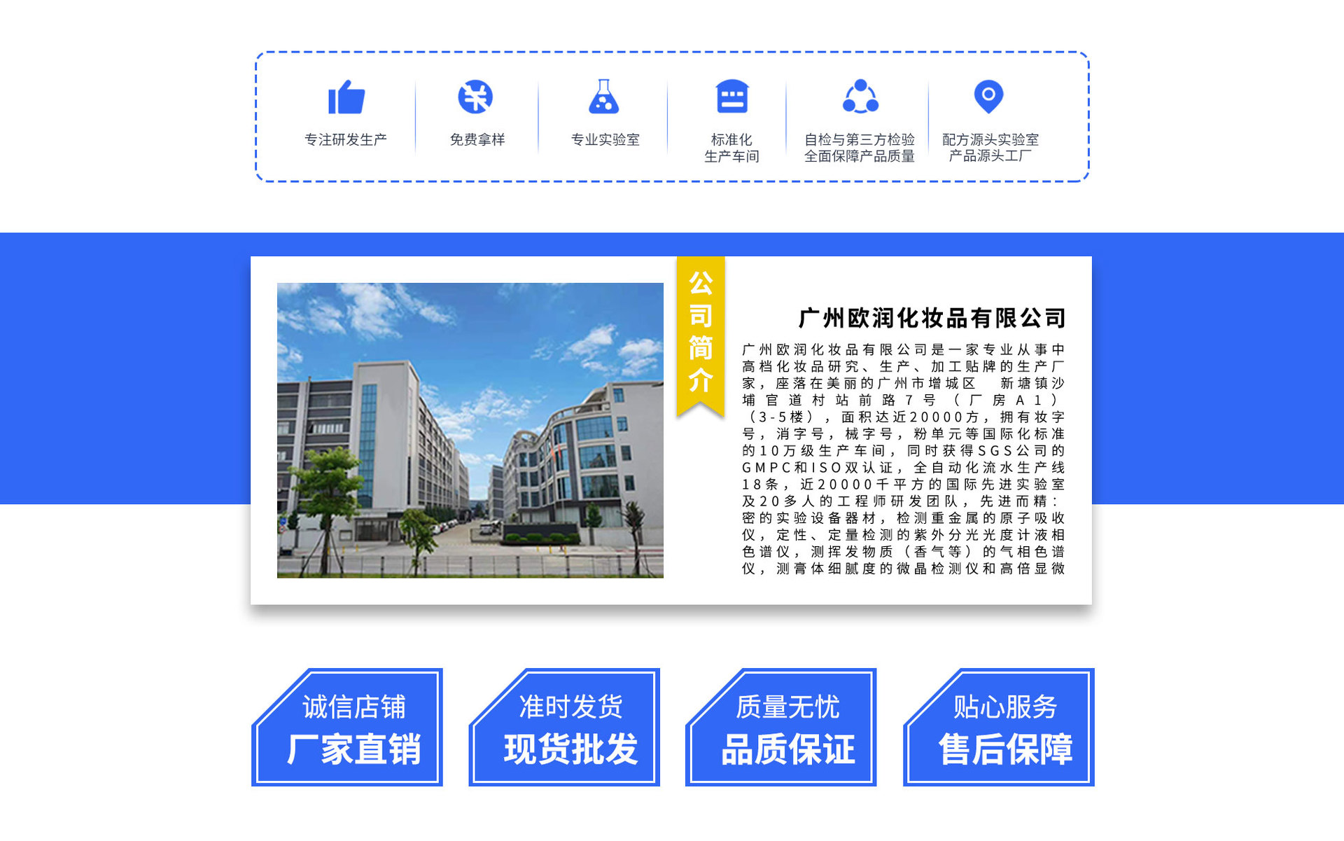 工廠面積達(dá)20000方,擁有妝字號,消字號,械字號,粉單元等國際化標(biāo)準(zhǔn)的10萬級生產(chǎn)車間,同時(shí)獲得SGS公司的GMPC和ISO雙認(rèn)證,全自動化流水生產(chǎn)線18條,近500平方的國際先進(jìn)的實(shí)驗(yàn)室及20多人的工程師研發(fā)團(tuán)隊(duì),產(chǎn)品覆蓋日化線、專業(yè)線、電商、微商、直銷直播、社團(tuán)等主流渠道。 企業(yè)匯集了大批高素質(zhì)的管理、生產(chǎn)研發(fā)、營銷人才,一直以來,公司一直始終不渝堅(jiān)持以追求卓越的品質(zhì),超凡的療效做好每一款產(chǎn)品,為每一位索尚時(shí)尚與健康的顧客提供最完美極致的純植物綠色安全產(chǎn)品和高品質(zhì)的服務(wù)。