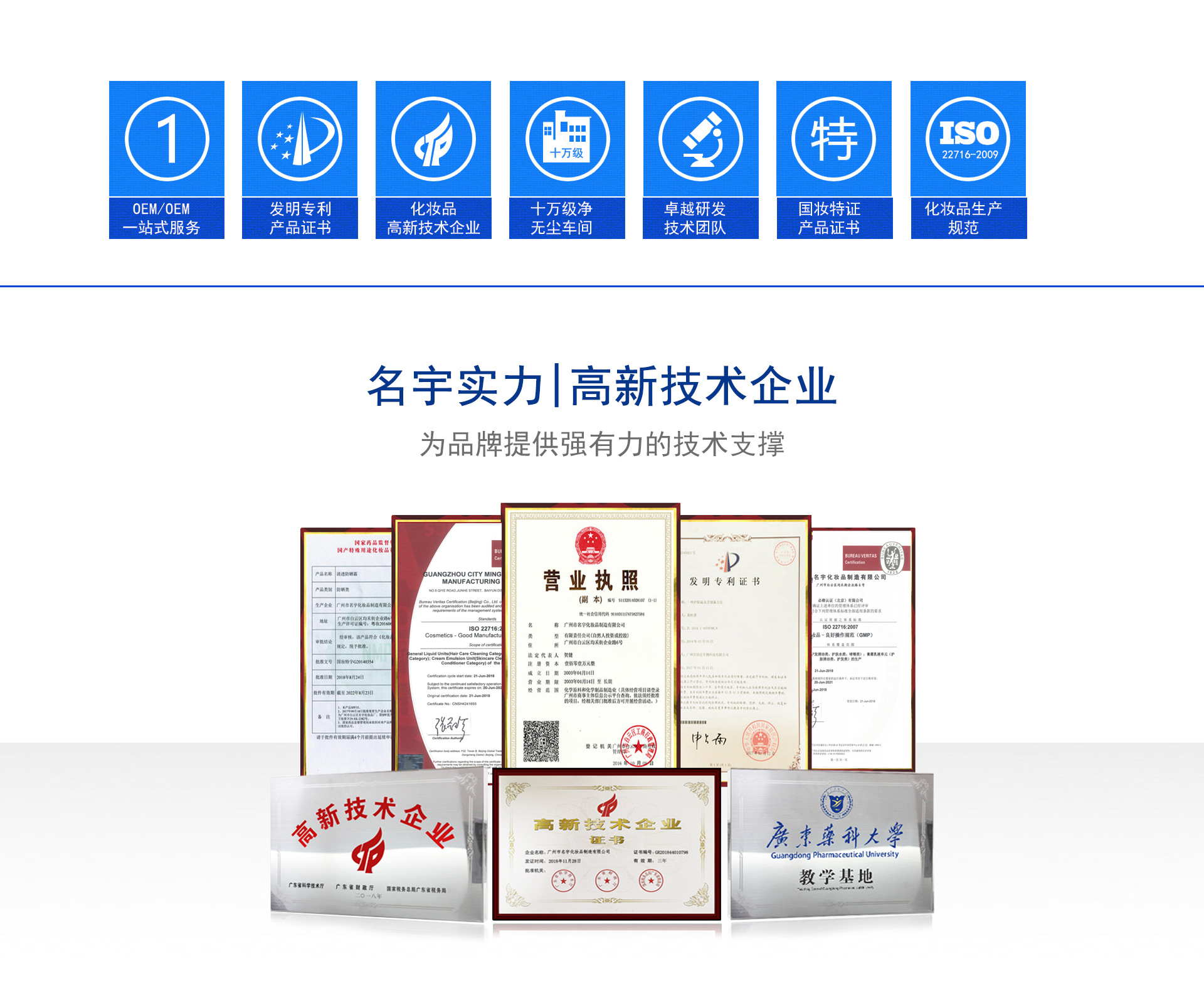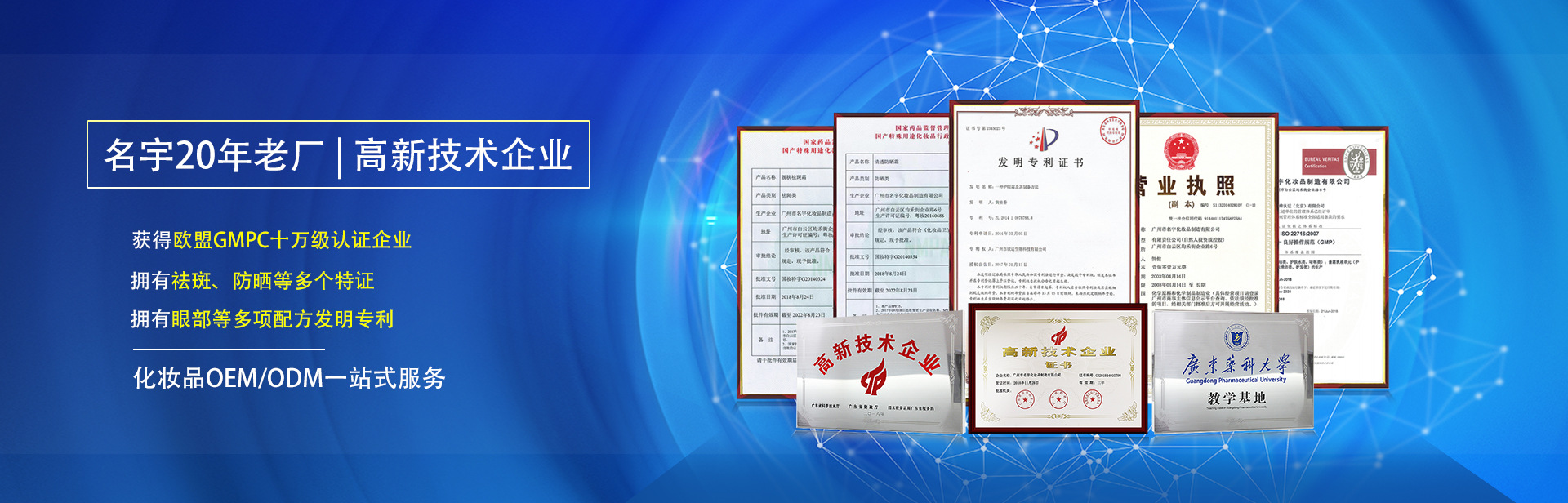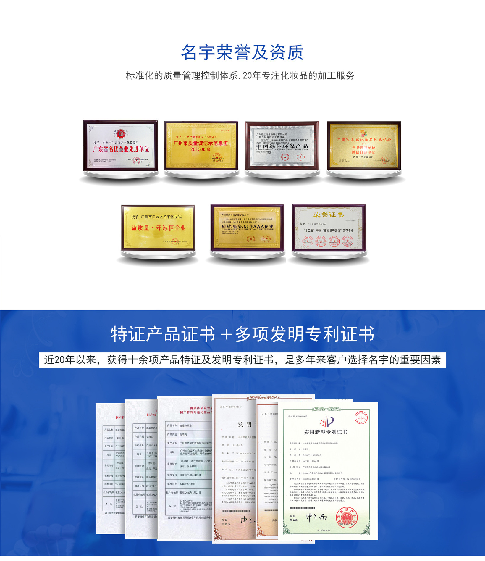 專注化妝品OEM加工18年,獲美國(guó)FDA歐盟GMPC十萬(wàn)級(jí)認(rèn)證、廣州市質(zhì)量協(xié)會(huì)會(huì)員單位、獲“質(zhì)量、服務(wù)、信譽(yù)”AAA企業(yè)稱號(hào);擁有美白、去斑、防曬等多個(gè)特證,及專利申請(qǐng)?zhí)枴?/p>