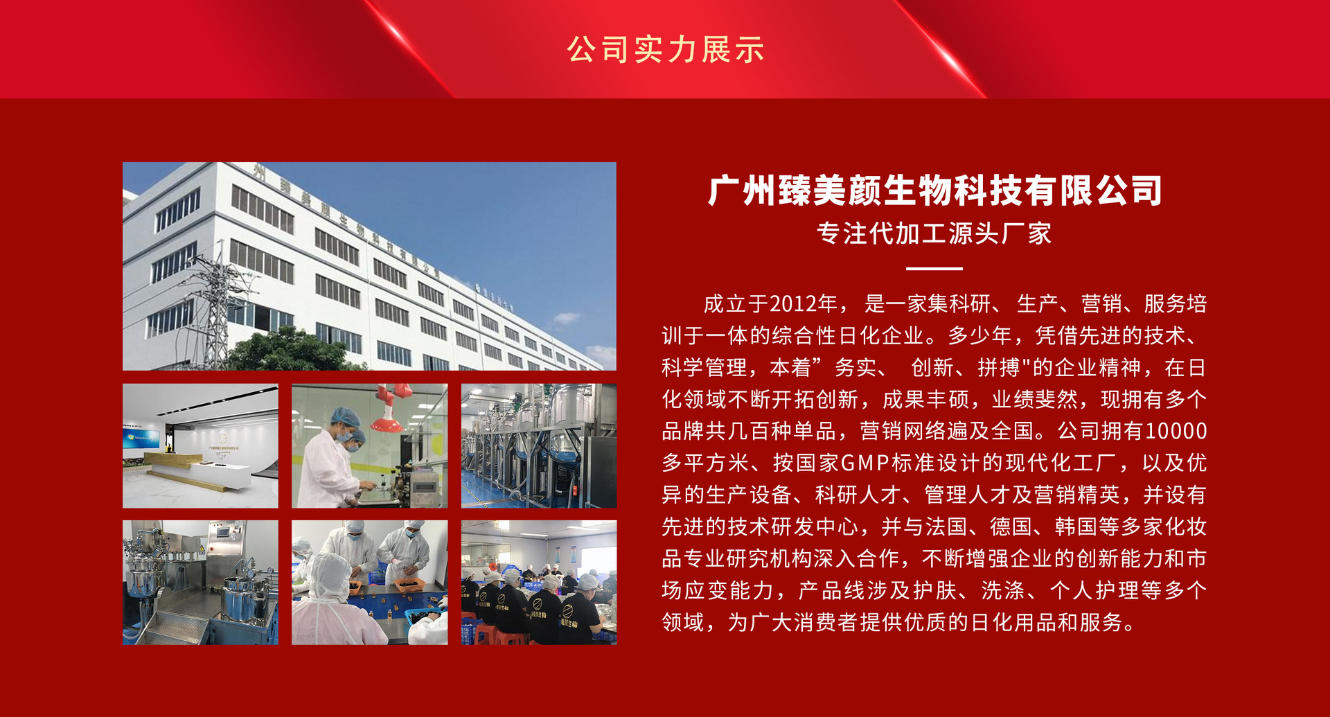 廣州臻美顏生物科技有限公司,成立于2012年,是一家集科研、生產(chǎn)、營銷、服務(wù)培訓(xùn)于一體的綜合性日化企業(yè)。憑借先進(jìn)的技術(shù)、科學(xué)管理,本著”務(wù)實、創(chuàng)新、拼搏的企業(yè)精神,在日化領(lǐng)域不斷開拓創(chuàng)新,成果豐碩,業(yè)績斐然,現(xiàn)擁有多個品牌共幾百種單品,營銷網(wǎng)絡(luò)遍及全國。 公司擁有10000多平方米、按國家GMP標(biāo)準(zhǔn)設(shè)計的現(xiàn)代化工廠,以及優(yōu)異的生產(chǎn)設(shè)備、科研人才、管理人才及營銷精英,并設(shè)有先進(jìn)的技術(shù)研發(fā)中心,并與法國、德國、韓國等多家化妝品專業(yè)研究機構(gòu)深入合作,不斷增強企業(yè)的創(chuàng)新能力和市場應(yīng)變能力,產(chǎn)品線涉及護膚、洗滌、個人護理等多個領(lǐng)域,為廣大消費者提供優(yōu)質(zhì)的日化用品和服務(wù)。