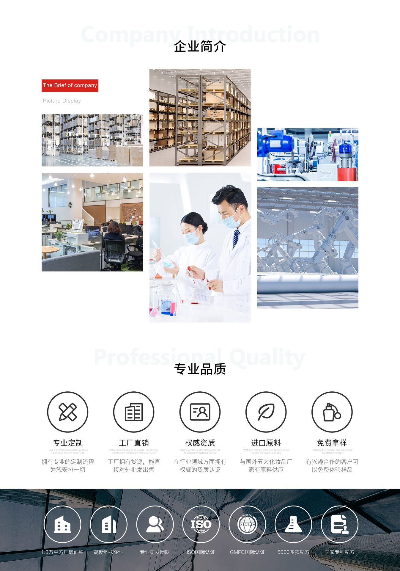 鑫龍化妝品廠是一家集化妝品研發(fā)、生產(chǎn)、銷售、服務(wù)于一體的大型化妝品公司,位于交通便捷、物流發(fā)達(dá)的廣東。提供專業(yè)化妝品加工OEM/ODM,天然植物精油加工,在行業(yè)內(nèi)頗具口碑、影響力,曾協(xié)助國內(nèi)外數(shù)百個化妝品 品牌成功上市。本公司擁有現(xiàn)代化的生產(chǎn)設(shè)備,GMP生產(chǎn)車間,先進(jìn)的ERP企業(yè)管理體系,并組建了一支由資深美容科研發(fā)專家、醫(yī)學(xué)教授、博士等組成的精英研發(fā)隊伍。與廣東藥科大學(xué)化妝品研究中心核心成員強強聯(lián)手,引入高科技臨界萃取技術(shù),將天然植物及中草藥有效成分應(yīng)用于化妝品中,構(gòu)建了集產(chǎn)品研發(fā)、項目服務(wù)、信息交流于一體的現(xiàn)代化研發(fā)體系,致力于為客戶提供好品質(zhì)的產(chǎn)品。 一站式服務(wù),協(xié)助您輕松擁有自己的化妝品品牌,設(shè)有專業(yè)化妝品加工品牌策劃部,傳媒廣告設(shè)計部,包材、原料采購部,產(chǎn)品研發(fā)中心。從策劃、設(shè)計、研發(fā)、采購、生產(chǎn)、出貨每一個環(huán)節(jié)均由本公司一體化,一站式精心打造。省去了您既找化妝品加工