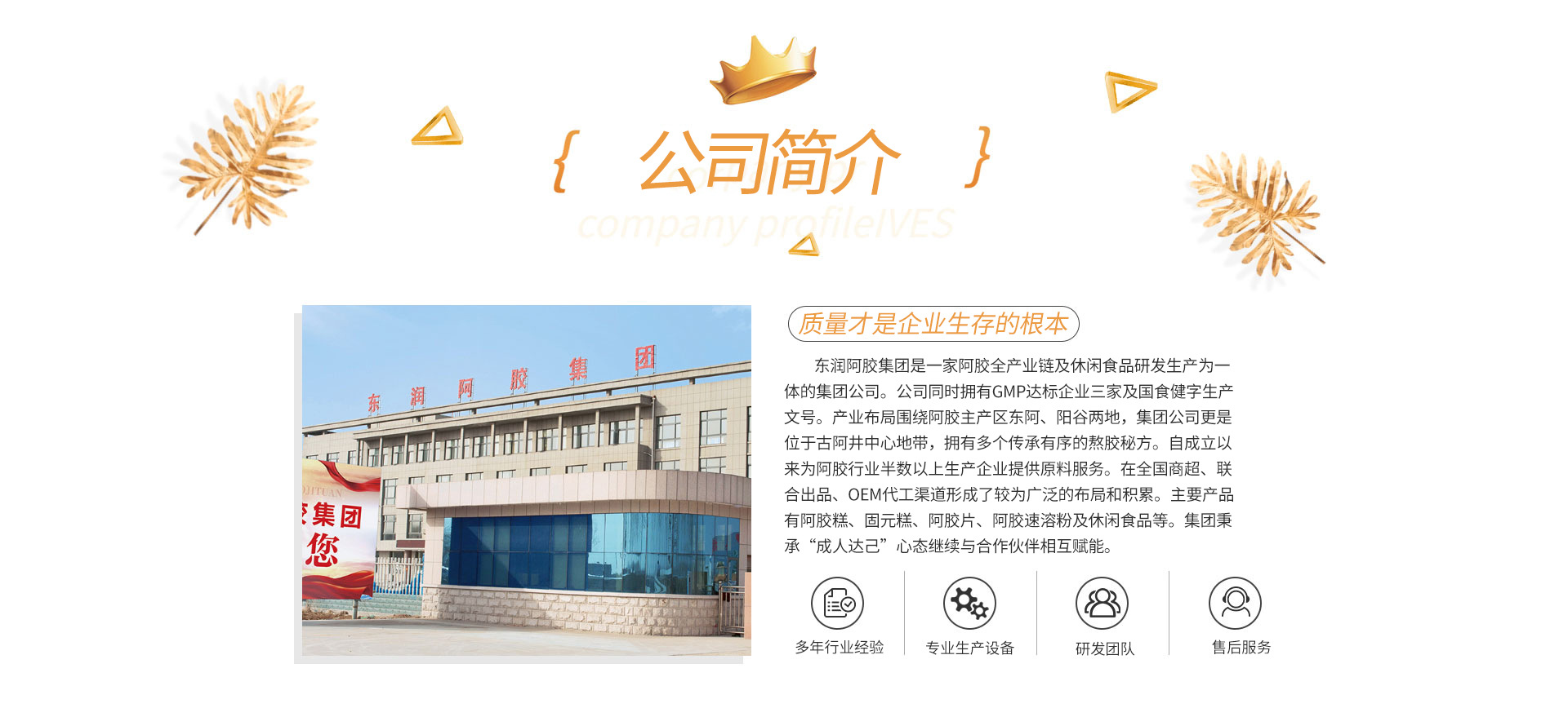 山東東潤(rùn)阿膠集團(tuán),前身為山東東潤(rùn)阿膠有限公司??傋?cè)資本2000萬(wàn)元。2010年建廠,2014年企業(yè)改組為集團(tuán)有限公司。同年,斥資2億擴(kuò)建廠房,新廠房占地面積100畝。其中,辦公樓建筑面積為5000平方,單生產(chǎn)車間占地面積為9000平方,生產(chǎn)車間全部參照國(guó)家最新版GMP標(biāo)準(zhǔn)設(shè)計(jì),車間內(nèi)均是國(guó)家醫(yī)藥級(jí)的生產(chǎn)設(shè)備,采用現(xiàn)代化的醫(yī)藥生產(chǎn)流程,并配有專門的質(zhì)量監(jiān)控系統(tǒng),全部符合醫(yī)藥保健行業(yè)生產(chǎn)標(biāo)準(zhǔn)。 東潤(rùn)阿膠集團(tuán)坐落于“泛東阿區(qū)”山東省聊城市阿城鎮(zhèn),唐宋時(shí)期的東阿縣治就在今天的阿城鎮(zhèn),因此阿城鎮(zhèn)又被稱為“古東阿”,這里是阿膠最古老的發(fā)源地,其阿膠文化底蘊(yùn)深厚,有著傳承數(shù)千年的阿膠熬制古方。聞名中外、享譽(yù)古今的“古阿井”就位于集團(tuán)附近的岳莊村。古阿井之水是熬治阿膠膠的關(guān)鍵所在,其水清冽甘甜,水質(zhì)優(yōu)良,含有多種對(duì)人體有益的微量元素,這些微量元素與阿膠中的蛋白質(zhì)、氨基酸結(jié)合形成有機(jī)鹽