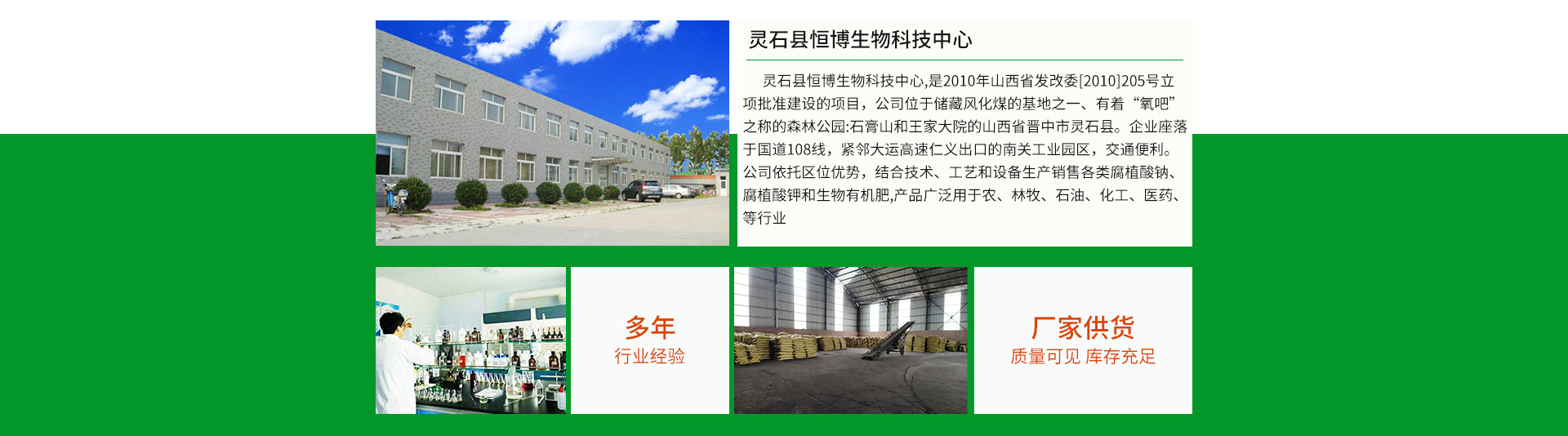 靈石縣恒博生物科技中心,是2010年山西省發(fā)改委[2010]205號立項批準建設(shè)的項目,公司位于全國儲藏優(yōu)質(zhì)風化煤的基地之一、有著“天然氧吧”之稱的國家級森林公園:石膏山和“華夏民居第一宅”王家大院的山西省晉中市靈石縣。企業(yè)座落于國道108線,緊鄰大運高速仁義出口的南關(guān)工業(yè)園區(qū),交通十分便利。公司依托區(qū)位優(yōu)勢,結(jié)合先進技術(shù)、工藝和設(shè)備專業(yè)生產(chǎn)銷售各類精制腐植酸鈉、腐植酸鉀和生物有機肥,產(chǎn)品廣泛用于農(nóng)、林、牧、石油、化工、醫(yī)藥、等行業(yè)。 公司弘揚“團結(jié)、敬業(yè)、高效、踏實”的企業(yè)精神,奉行產(chǎn)品質(zhì)量甚于生命,用戶利益高于一切的經(jīng)營理念,內(nèi)拓現(xiàn)代管理,外建市場營銷網(wǎng)絡(luò),竭誠做好售后服務(wù),贏得了廣大用戶的信懶。我公司本著:“以質(zhì)量求生存,靠信譽求發(fā)展”和“未來成功者屬于質(zhì)量領(lǐng)先者的世紀”的經(jīng)營理念,追求卓越無止境,與時俱進創(chuàng)未來。產(chǎn)品遠銷美國、日本、印度等國,和國內(nèi)20多個省份的客戶保持著良好的合作