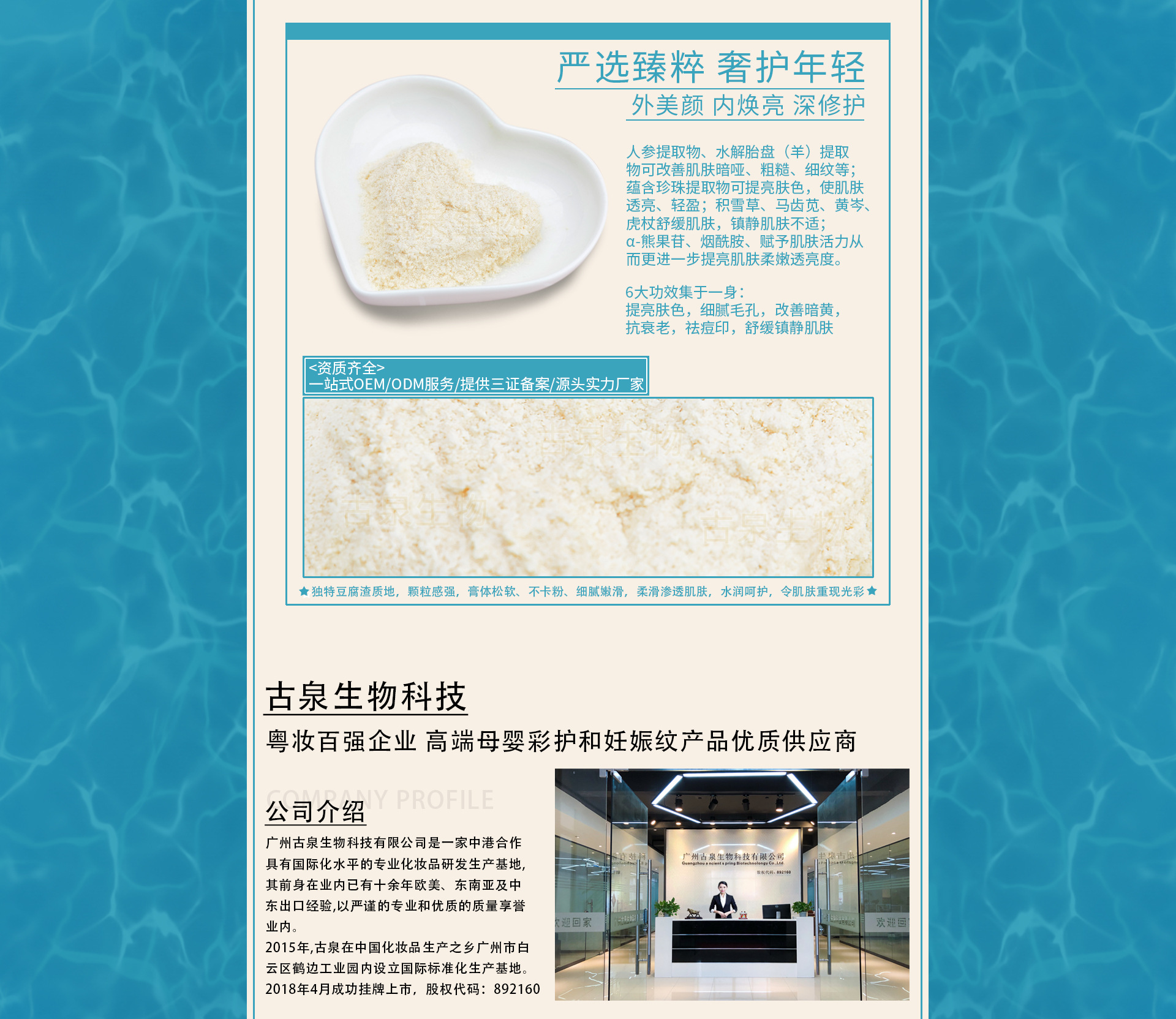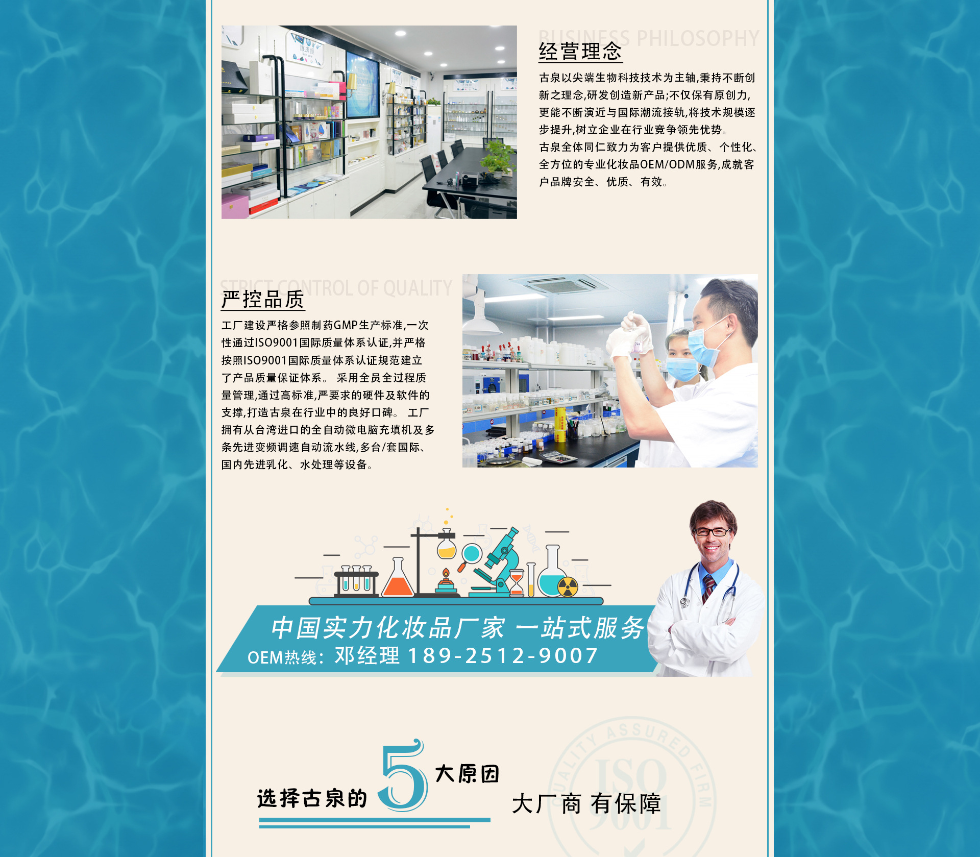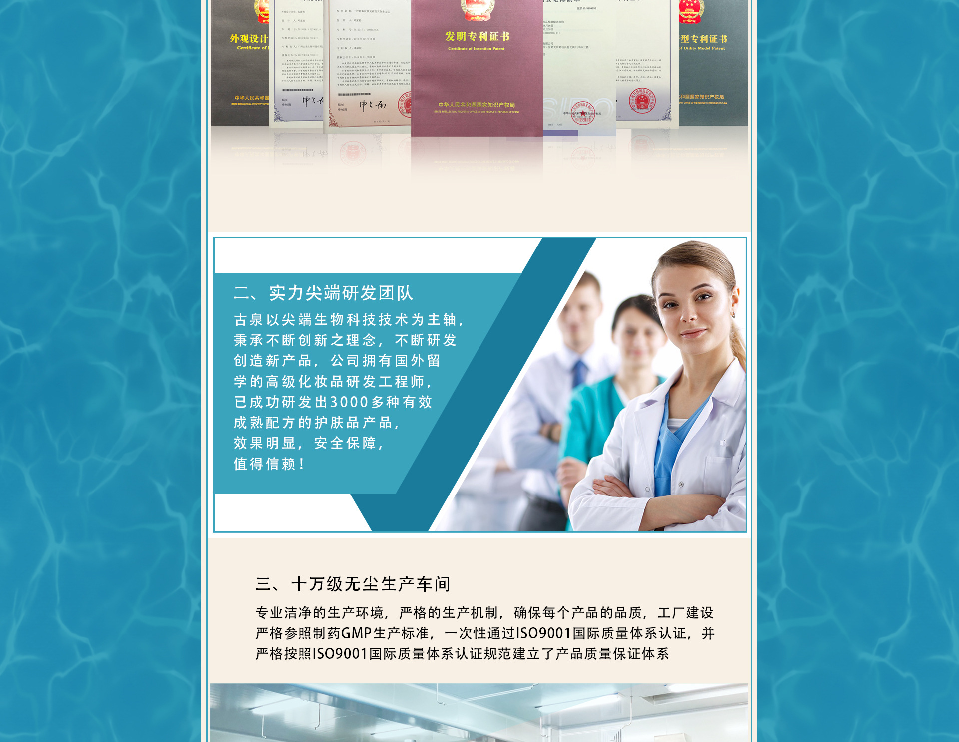 廣州古泉生物科技有限公司是一家中港合作具有國際化水平的專業(yè)化妝品研發(fā)生產(chǎn)基地,其前身在業(yè)內(nèi)已有十余年歐美、東南亞及中東出口經(jīng)驗,以嚴(yán)謹?shù)膶I(yè)和優(yōu)質(zhì)的質(zhì)量享譽業(yè)內(nèi)。 2015年,古泉在中國化妝品生產(chǎn)之鄉(xiāng)廣州市白云區(qū)鶴邊工業(yè)園內(nèi)設(shè)立國際標(biāo)準(zhǔn)化生產(chǎn)基地。 工廠建設(shè)嚴(yán)格參照制藥GMP生產(chǎn)標(biāo)準(zhǔn),一次性通過ISO9001國際質(zhì)量體系認證,并嚴(yán)格按照ISO9001國際質(zhì)量體系認證規(guī)范建立了產(chǎn)品質(zhì)量保證體系。 采用全員全過程質(zhì)量管理,通過高標(biāo)準(zhǔn),嚴(yán)要求的硬件及軟件的支撐,打造古泉在行業(yè)中的良好口碑。 工廠擁有從臺灣進口的全自動微電腦充填機及多條先進變頻調(diào)速自動流水線,多臺/套國際、國內(nèi)先進乳化、水處理等設(shè)備。 古泉以尖端生物科技技術(shù)為主軸,秉持不斷創(chuàng)新之理念,研發(fā)創(chuàng)造新產(chǎn)品;不僅保有原創(chuàng)力,更能不斷演近與國際潮流接軌,將技術(shù)規(guī)模逐步提升,樹立企業(yè)在行業(yè)競爭領(lǐng)先優(yōu)勢。