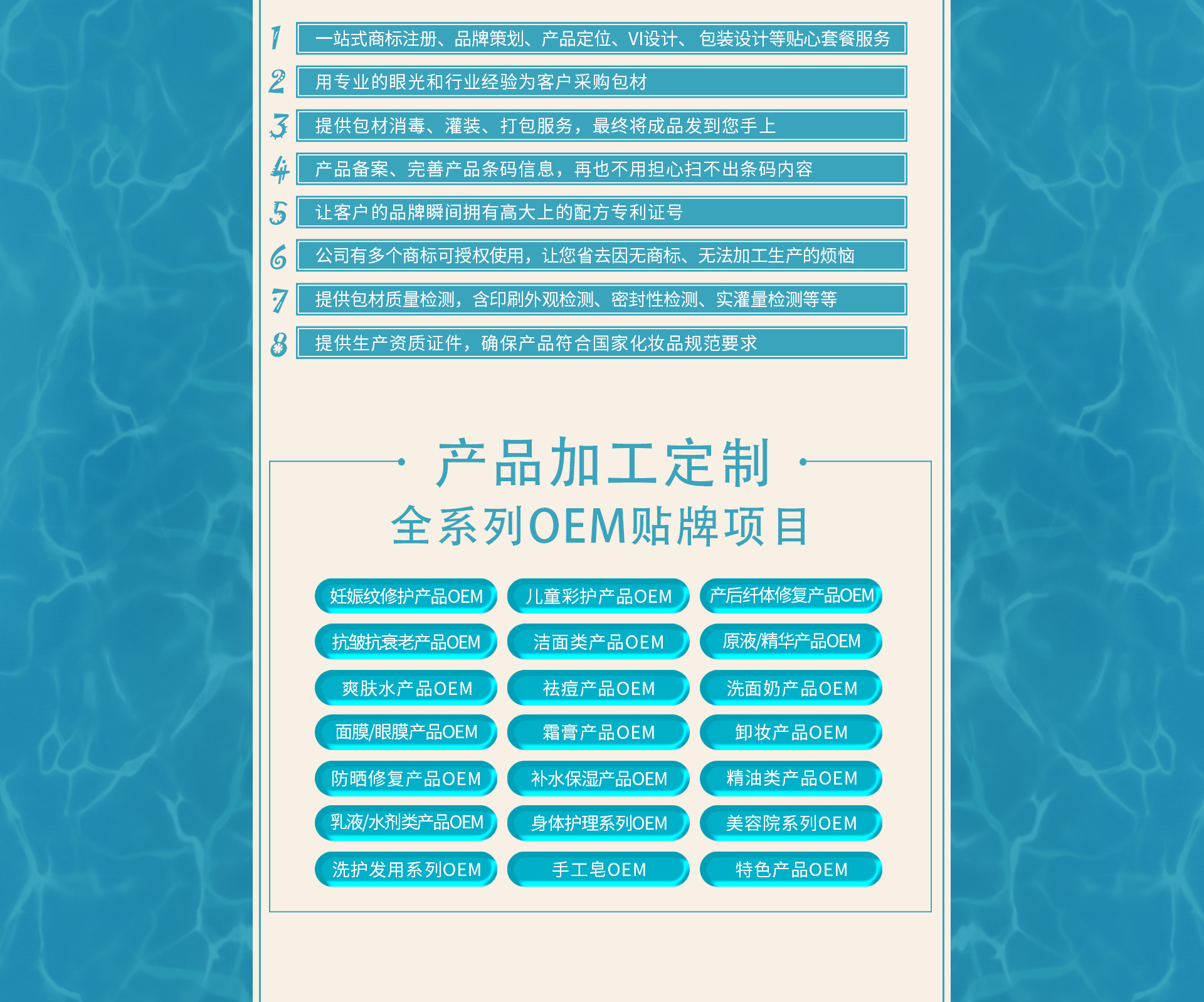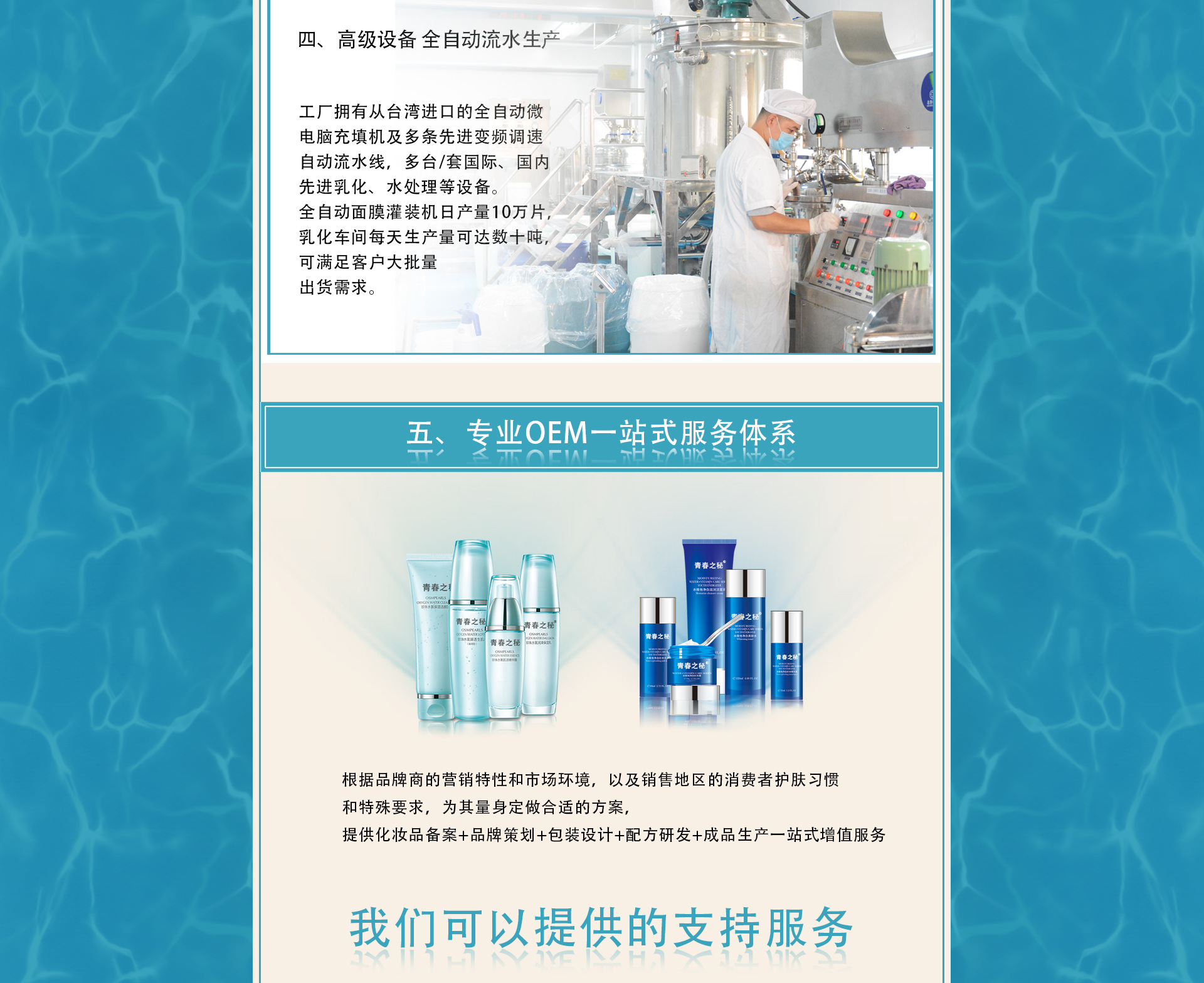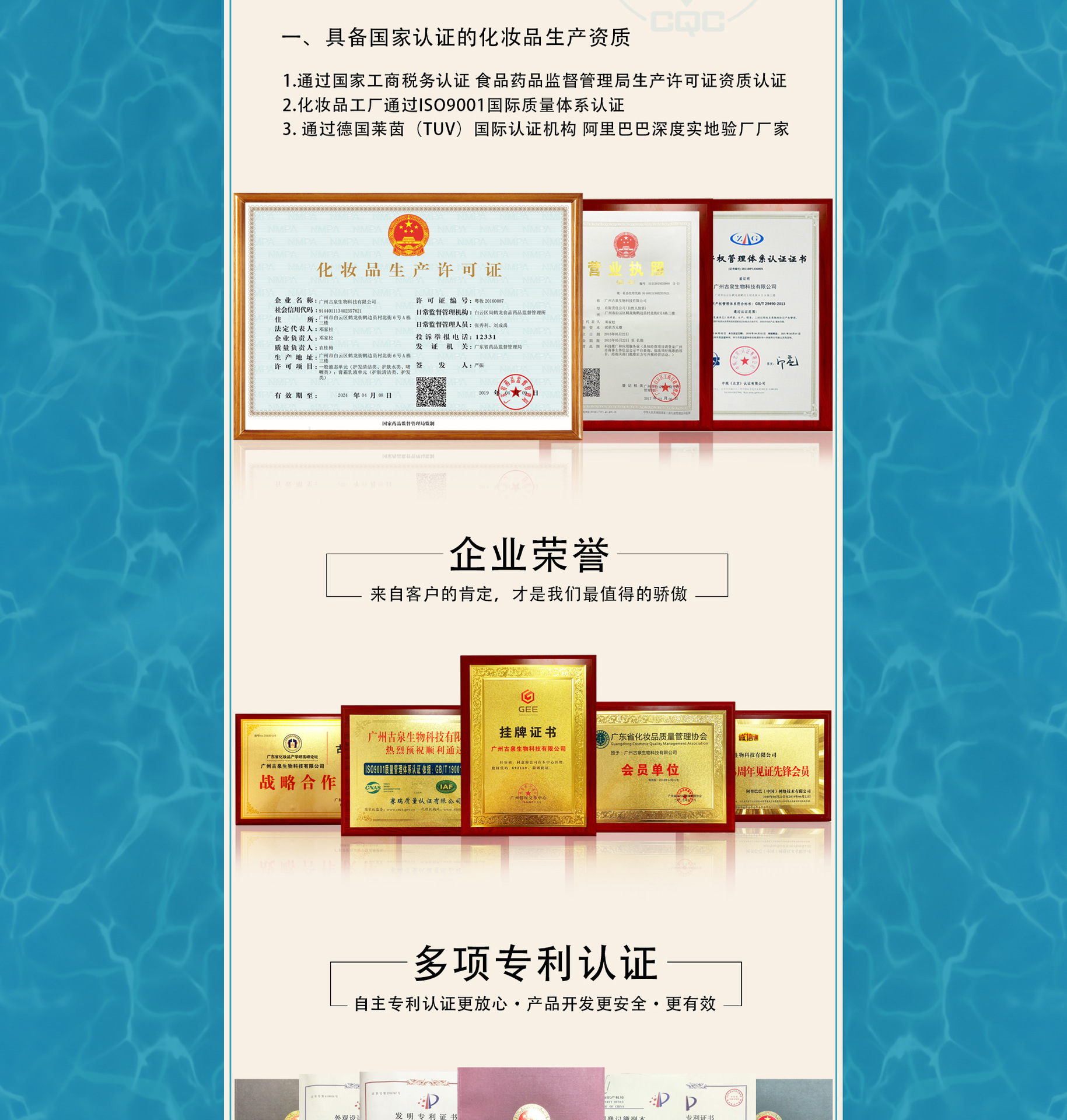 廣州古泉生物科技有限公司是一家中港合作具有國際化水平的專業(yè)化妝品研發(fā)生產(chǎn)基地,其前身在業(yè)內(nèi)已有十余年歐美、東南亞及中東出口經(jīng)驗,以嚴(yán)謹?shù)膶I(yè)和優(yōu)質(zhì)的質(zhì)量享譽業(yè)內(nèi)。 2015年,古泉在中國化妝品生產(chǎn)之鄉(xiāng)廣州市白云區(qū)鶴邊工業(yè)園內(nèi)設(shè)立國際標(biāo)準(zhǔn)化生產(chǎn)基地。 工廠建設(shè)嚴(yán)格參照制藥GMP生產(chǎn)標(biāo)準(zhǔn),一次性通過ISO9001國際質(zhì)量體系認證,并嚴(yán)格按照ISO9001國際質(zhì)量體系認證規(guī)范建立了產(chǎn)品質(zhì)量保證體系。 采用全員全過程質(zhì)量管理,通過高標(biāo)準(zhǔn),嚴(yán)要求的硬件及軟件的支撐,打造古泉在行業(yè)中的良好口碑。 工廠擁有從臺灣進口的全自動微電腦充填機及多條先進變頻調(diào)速自動流水線,多臺/套國際、國內(nèi)先進乳化、水處理等設(shè)備。 古泉以尖端生物科技技術(shù)為主軸,秉持不斷創(chuàng)新之理念,研發(fā)創(chuàng)造新產(chǎn)品;不僅保有原創(chuàng)力,更能不斷演近與國際潮流接軌,將技術(shù)規(guī)模逐步提升,樹立企業(yè)在行業(yè)競爭領(lǐng)先優(yōu)勢。