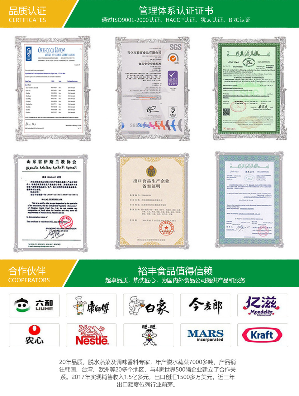 興化市裕豐食品有限公司為聯(lián)富食品分公司,為了適應(yīng)市場(chǎng)發(fā)展的需要于2017年10月創(chuàng)建。其經(jīng)營(yíng)模式和理念既延續(xù)了傳統(tǒng)生產(chǎn)工藝,又在原有基礎(chǔ)上開拓創(chuàng)新,與時(shí)俱進(jìn)尤其注重預(yù)包裝產(chǎn)品的零售與銷售。興化市聯(lián)富食品有限公司組建于1999年,是一家集生產(chǎn)、研發(fā)、銷售為一體的省級(jí)農(nóng)業(yè)產(chǎn)龍頭企業(yè),也是一家農(nóng)業(yè)生態(tài)循環(huán)型企業(yè),所處的興化市脫水蔬菜加工園區(qū)是綠色食品脫水蔬菜生產(chǎn)基地之一,廠區(qū)面積20000平方米,固定資產(chǎn)4300 多萬(wàn)元,職工人數(shù)410人,研發(fā)人員26人。在傳統(tǒng)脫水蔬菜生產(chǎn)技術(shù)升級(jí)的同時(shí),公司與江蘇省農(nóng)業(yè)科學(xué)院、南京農(nóng)業(yè)大學(xué)開展產(chǎn)學(xué)研合作,建立研究生工作站。實(shí)現(xiàn)企業(yè)產(chǎn)品升級(jí)與轉(zhuǎn)型的同步協(xié)調(diào)發(fā)展,帶動(dòng)行業(yè)發(fā)展。