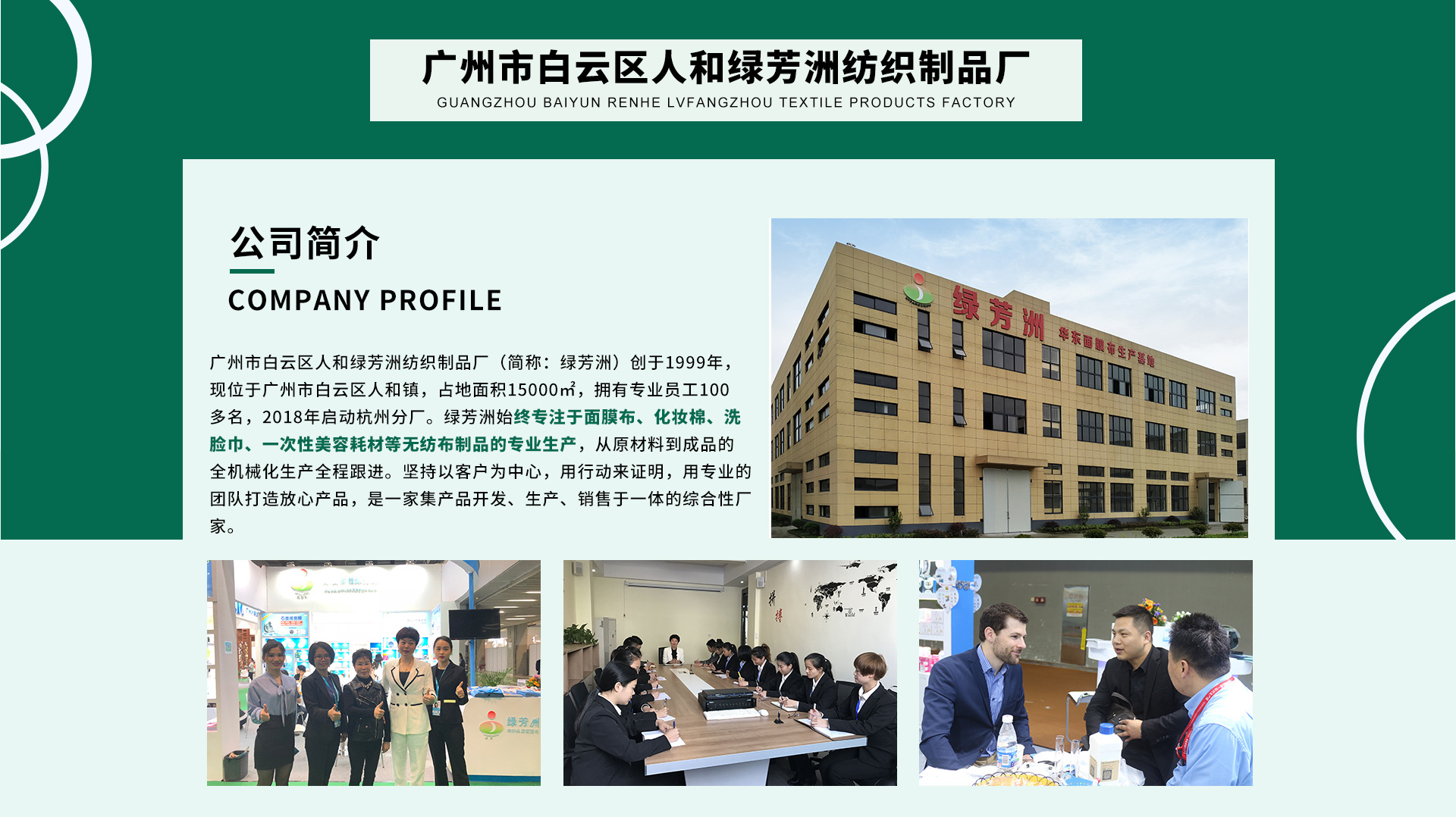 綠芳洲集團,始創(chuàng)于1999年,是一家專注于無紡制品集產品開發(fā)、生產、銷售于一體的綜合性公司,產品遠銷數十個國家和地區(qū)。 1.產品全且優(yōu):實現了從產品原材料到成品的全程跟進.所經營的產品品牌得到市場高度認可,國內外均暢銷,產品如:脫毛紙、圍脖紙、一次性床單(床罩)、一次性拖鞋、一次性內衣褲、口罩、面膜基布、化妝棉、潔面巾等美容美體美甲耗材品 2.團隊強:綠芳洲公司通過前幾年的穩(wěn)扎穩(wěn)打,到近兩年的快速發(fā)展,目前銜接緊密的服務管理團隊,團隊與團隊之間相互交融又積極競爭,共同進步。 3.人員強:公司團隊成員整體年輕,有業(yè)務、管理經驗豐富的高層,有積極肯干、獨當一面的中層,有充滿朝氣、銳意進取的執(zhí)行層,不以學歷論能力以態(tài)度論能干;重視人員綜合素質的提升; 4.沉淀久:綠芳洲公司自1999年創(chuàng)立以來,一直專注于無紡制品的環(huán)保技術的研發(fā)、制造與銷售,通過將近20年的不斷積累,企業(yè)無論是在資金實力、研發(fā)能