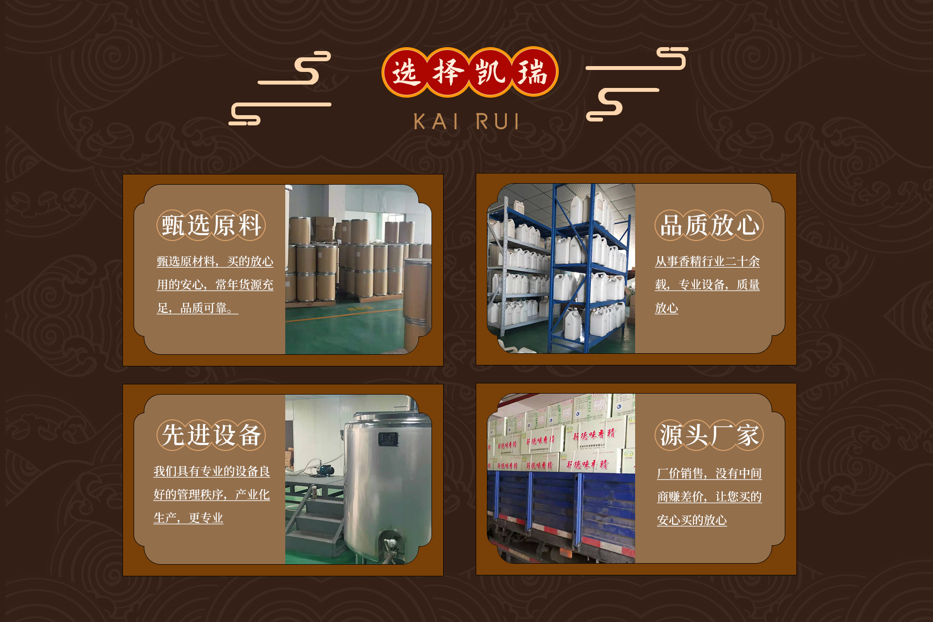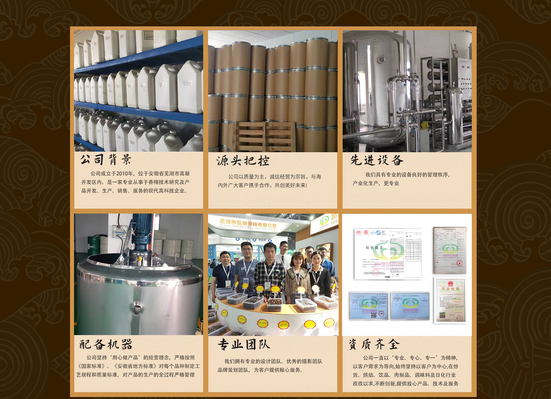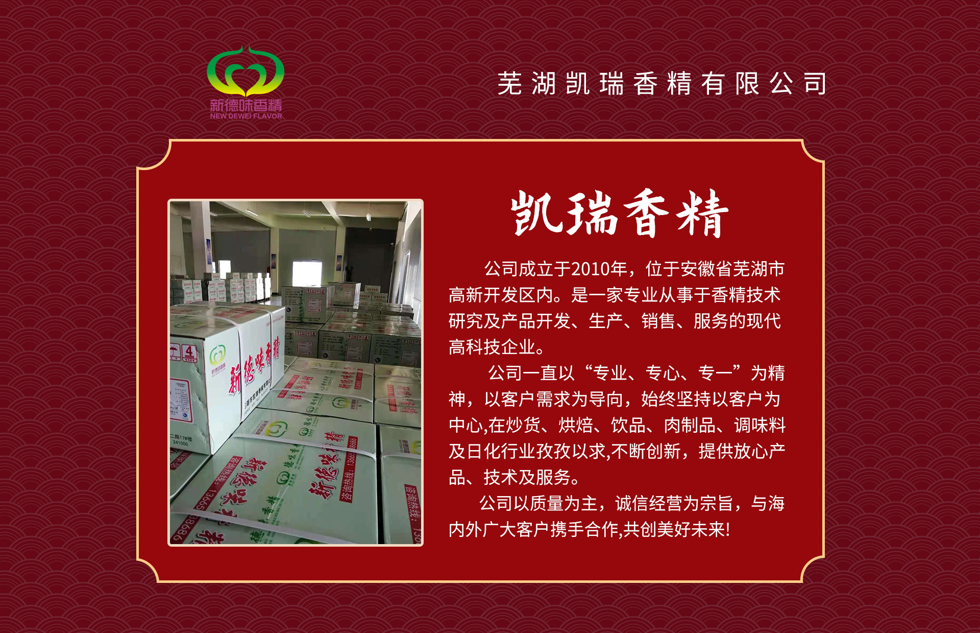 蕪湖市凱瑞香精有限公司成立于2010年,位于安徽省蕪湖市高新開(kāi)發(fā)區(qū),是一家專(zhuān)業(yè)從事香精技術(shù)研究、生產(chǎn)、銷(xiāo)售、應(yīng)用服務(wù)的現(xiàn)代高科技企業(yè)。公司擁有國(guó)內(nèi)資深調(diào)香師,產(chǎn)品技術(shù)儲(chǔ)備達(dá)到2萬(wàn)余種。同時(shí),公司積極與多所高??蒲袡C(jī)構(gòu)緊密合作。 數(shù)年來(lái),公司積極吸取國(guó)內(nèi)外先進(jìn)的創(chuàng)香思想,先進(jìn)的香精技術(shù)和工藝,集多年來(lái)在香精行業(yè)的智慧和經(jīng)驗(yàn),香精的自然柔潤(rùn)、穩(wěn)定性、品質(zhì)的保障,得到客戶(hù)的青睞!憑著先進(jìn)的技術(shù)、卓越的品質(zhì)、完善的服務(wù),我公司產(chǎn)品立足國(guó)內(nèi)香精行業(yè),產(chǎn)品遍及全國(guó)各地,我們用心倡導(dǎo):以市場(chǎng)為導(dǎo)向,以科研為龍頭,以創(chuàng)新為手段,以技術(shù)應(yīng)用服務(wù)滿(mǎn)足客戶(hù)需求,用心開(kāi)拓國(guó)內(nèi)外市場(chǎng)。 公司一直以“專(zhuān)業(yè)、專(zhuān)心、專(zhuān)一”為精神,始終堅(jiān)持以客戶(hù)為中心,在乳品、炒貨、飲品、肉制品等行業(yè),孜孜以求,不斷創(chuàng)新。公司堅(jiān)持質(zhì)量第一,誠(chéng)信經(jīng)營(yíng)為宗旨,與廣大海內(nèi)外客戶(hù)攜手合作,共創(chuàng)美好未來(lái)