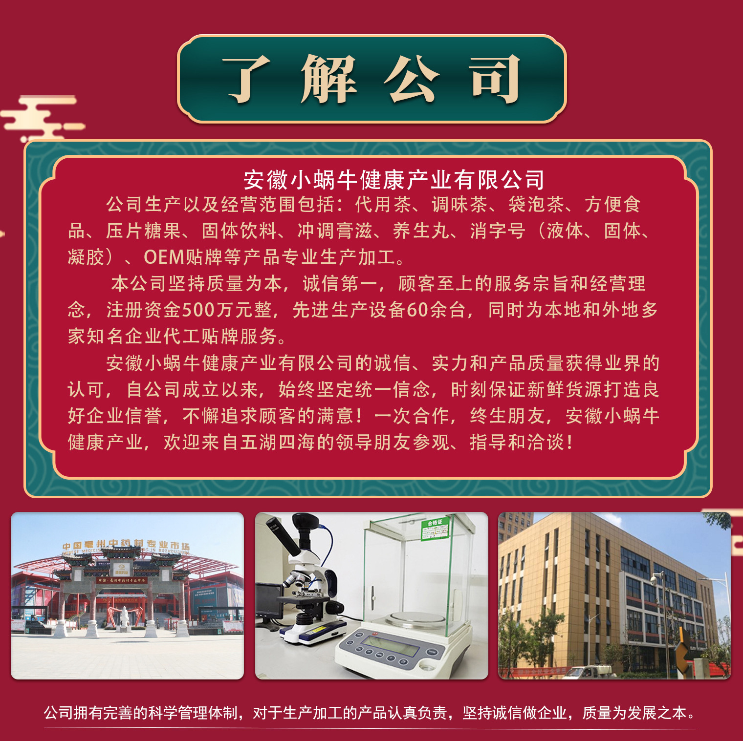 安徽小蝸牛健康產(chǎn)業(yè)有限公司是一家專業(yè)設(shè)計、研發(fā)、生產(chǎn)于一體的現(xiàn)代化公司,公司生產(chǎn)包括代用茶、調(diào)味茶、方便食品、壓片糖果、固體飲料、膏滋、丸、消字號(液體、固體、凝膠)等產(chǎn)品貼牌oem、odm生產(chǎn)加工。 本公司堅持以質(zhì)量為本,誠信第一,顧客至上的服務(wù)宗旨和經(jīng)營理念,注冊資金500萬元,先進(jìn)設(shè)備60余臺,同時為本地和外地多家知名企業(yè)代工貼牌服務(wù)。 安徽小蝸牛健康產(chǎn)業(yè)有限公司的誠信、實力和產(chǎn)品質(zhì)量獲得業(yè)界的認(rèn)可,自公司成立以來,始終堅持統(tǒng)一信念,時刻保證新鮮貨源打造良好企業(yè)信譽,不懈追求顧客的滿意,一次合作,終生朋友,安徽小蝸牛健康產(chǎn)業(yè)有限公司歡迎來自五湖四海的領(lǐng)導(dǎo)朋友參觀、指導(dǎo)和洽淡。