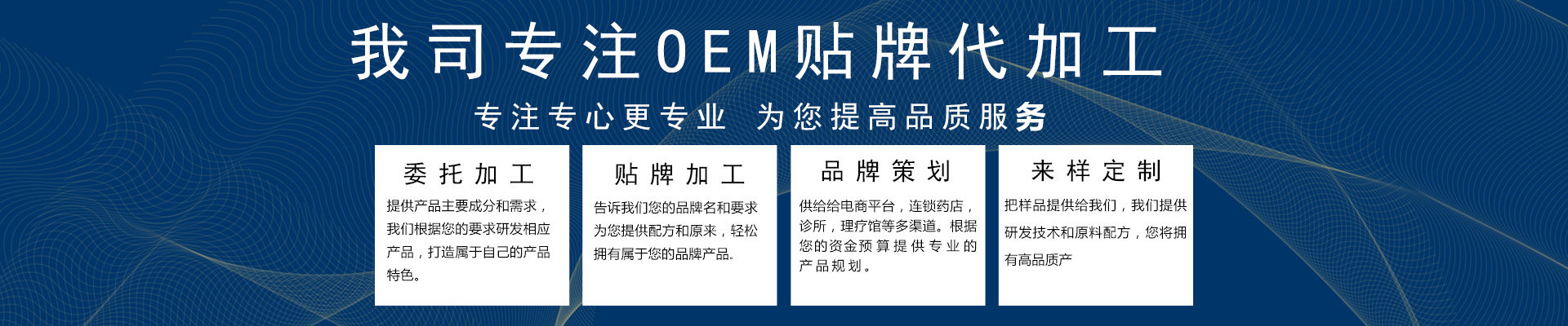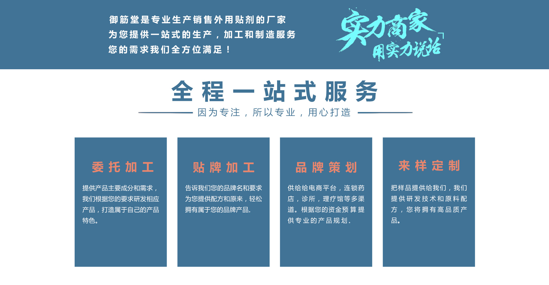 安徽御筋堂藥業(yè)有限公司是一家集醫(yī)療器械,膏藥貼加工、中藥藥包,藥酒、內(nèi)服產(chǎn)品等研發(fā),生產(chǎn),銷售于一體的企業(yè)集團(tuán)并已經(jīng)形成多元化現(xiàn)代特色中醫(yī)藥產(chǎn)業(yè)集群。公司現(xiàn)有高水平生產(chǎn)設(shè)備進(jìn)行不間斷流水作業(yè),持有各類正規(guī)批準(zhǔn)文號(hào),有自主品牌產(chǎn)品,黑膏藥貼牌代理面向國(guó)內(nèi)外、可膏藥加工貼牌。有自己專業(yè)創(chuàng)新科研隊(duì)伍秉承“質(zhì)量為首、客戶服務(wù)、誠(chéng)信合作”為核心,在傳統(tǒng)醫(yī)藥文化基礎(chǔ)上,不斷挖掘民間傳統(tǒng)驗(yàn)方,結(jié)合高新技術(shù)生產(chǎn)工藝,生產(chǎn)出擁有自主知識(shí)產(chǎn)權(quán)的各種新產(chǎn)品嚴(yán)謹(jǐn)?shù)墓ぷ髯黠L(fēng)與誠(chéng)信的合作態(tài)度是我們的原則,與新老客戶長(zhǎng)期、穩(wěn)定、不斷增長(zhǎng)的收益是對(duì)我們的肯定,能為人類健康作出貢獻(xiàn)是我們持續(xù)不變的目標(biāo)!