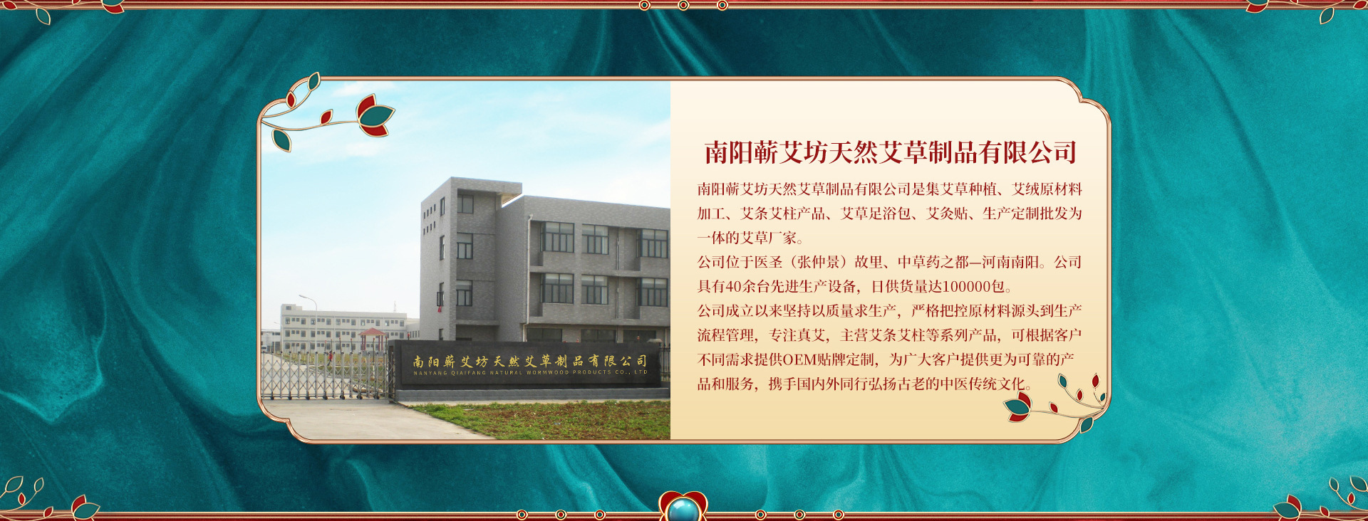 南陽蘄艾坊天然艾草制品有限公司是集艾條生產(chǎn)、開發(fā)、研制、艾條批發(fā)、艾條定制、銷售經(jīng)營為一體。多年來銳意進(jìn)取致力于艾草制品的不斷研發(fā)。公司位于----河南南陽。憑借著得天獨(dú)厚的生態(tài)環(huán)境和豐富優(yōu)質(zhì)的艾草資源為產(chǎn)品提供了優(yōu)質(zhì)的保證。我公司先后研發(fā)出傳統(tǒng)艾條,無煙艾條,艾絨、艾粒、迷你灸 、隨身灸系、足浴包、艾絨布藝品等近幾十種產(chǎn)品。公司從成立以來主要從事艾草制品的OEM加工、貼牌加工、特制定制規(guī)格加工、艾灸館特約加工定制生產(chǎn)等等。