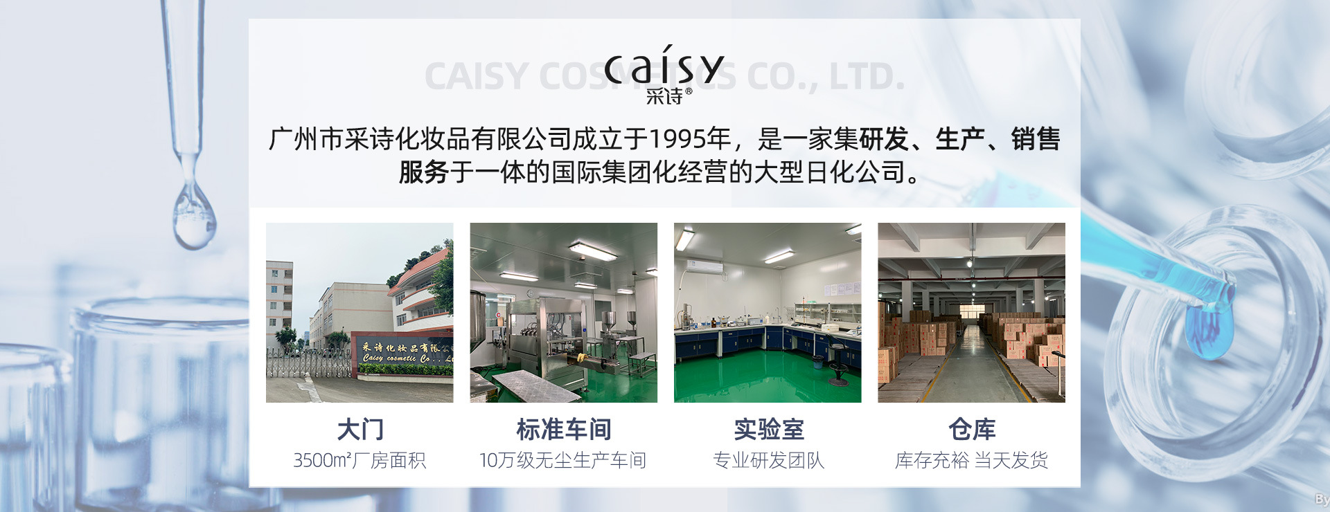 廣州市采詩化妝品有限公司成立于1995年,是一家集研發(fā)、生產(chǎn)、銷售、服務于一體的國際集團化經(jīng)營的大型日化公司。工廠面積達3500㎡,有著10萬級無塵車間,以及全自動化妝品生產(chǎn)線。采詩品牌已進入全國30多個省、市、自治區(qū)的約3000多個零售店,且與大潤發(fā)、世紀聯(lián)華永輝超市等商超有合作上架銷售