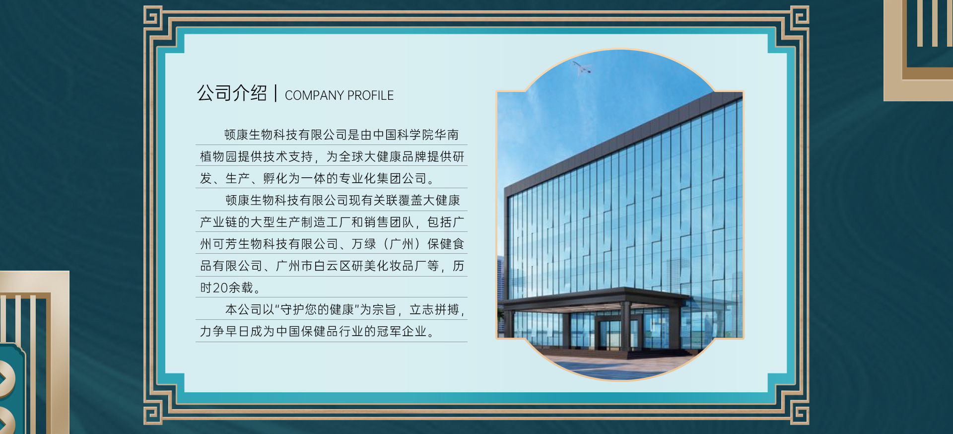 頓康生物科技有限公司是由中國科學院華南植物園提供技術支持,為全球大健康品牌提供研發(fā)、生產(chǎn)、孵化為一體的專業(yè)化集團公司。 頓康生物科技有限公司現(xiàn)有關聯(lián)覆蓋大健康產(chǎn)業(yè)的大型生產(chǎn)制造工廠和銷售團隊,包括;萬綠(廣州)保健食品有限公司、廣州可芳生物科技有限公司、廣州白云區(qū)研美化州品廠等,歷時20余載。 本公司以“守護您的健康”為宗旨,立志拼搏力爭早日成為保健食品行業(yè)的冠軍企業(yè)。