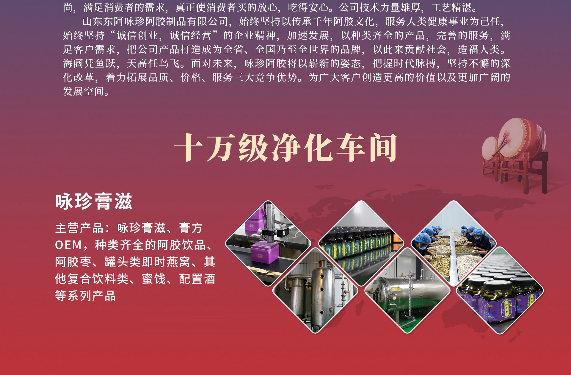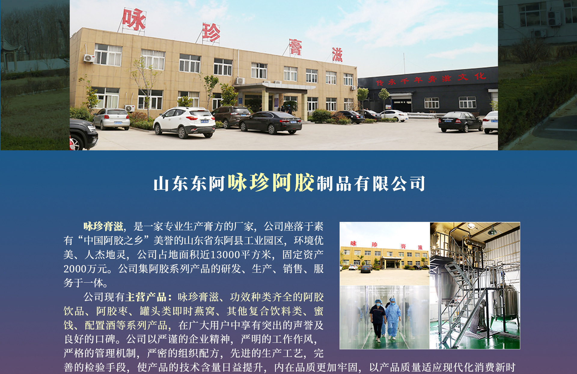詠珍膏滋,是一家專業(yè)生產(chǎn)膏方的廠家,公司座落于素有“中國阿膠之鄉(xiāng)”美譽(yù)的山東省東阿縣工業(yè)園區(qū),環(huán)境優(yōu)美、人杰地靈,公司占地面積近13000平方米,固定資產(chǎn)2000萬元。公司集阿膠系列產(chǎn)品的研發(fā)、生產(chǎn)、銷售、服務(wù)于一體。公司現(xiàn)有主導(dǎo)產(chǎn)品:詠珍膏滋、功效種類齊全的阿膠飲品、阿膠棗、罐頭類即時燕窩、其他復(fù)合飲料類、蜜餞、配置酒等系列產(chǎn)品,在廣大用戶中享有突出的聲譽(yù)及良好的口碑。公司以嚴(yán)謹(jǐn)?shù)钠髽I(yè)精神,嚴(yán)明的工作作風(fēng),嚴(yán)格的管理機(jī)制,嚴(yán)密的組織配方,先進(jìn)的生產(chǎn)工藝,完善的檢驗手段,使產(chǎn)品的技術(shù)含量日益提升,內(nèi)在品質(zhì)更加牢固,以產(chǎn)品質(zhì)量適應(yīng)現(xiàn)代化消費(fèi)新時尚,滿足消費(fèi)者的需求,真正使消費(fèi)者買的放心,吃得安心。公司技術(shù)力量雄厚,工藝精湛。山東東阿詠珍阿膠制品有限公司,始終堅持以傳承千年阿膠文化,服務(wù)人類健康事業(yè)為己任,始終堅持“誠信創(chuàng)業(yè),誠信經(jīng)營”的企業(yè)精神,加速發(fā)展,以種類齊全的產(chǎn)品,完善的服務(wù)