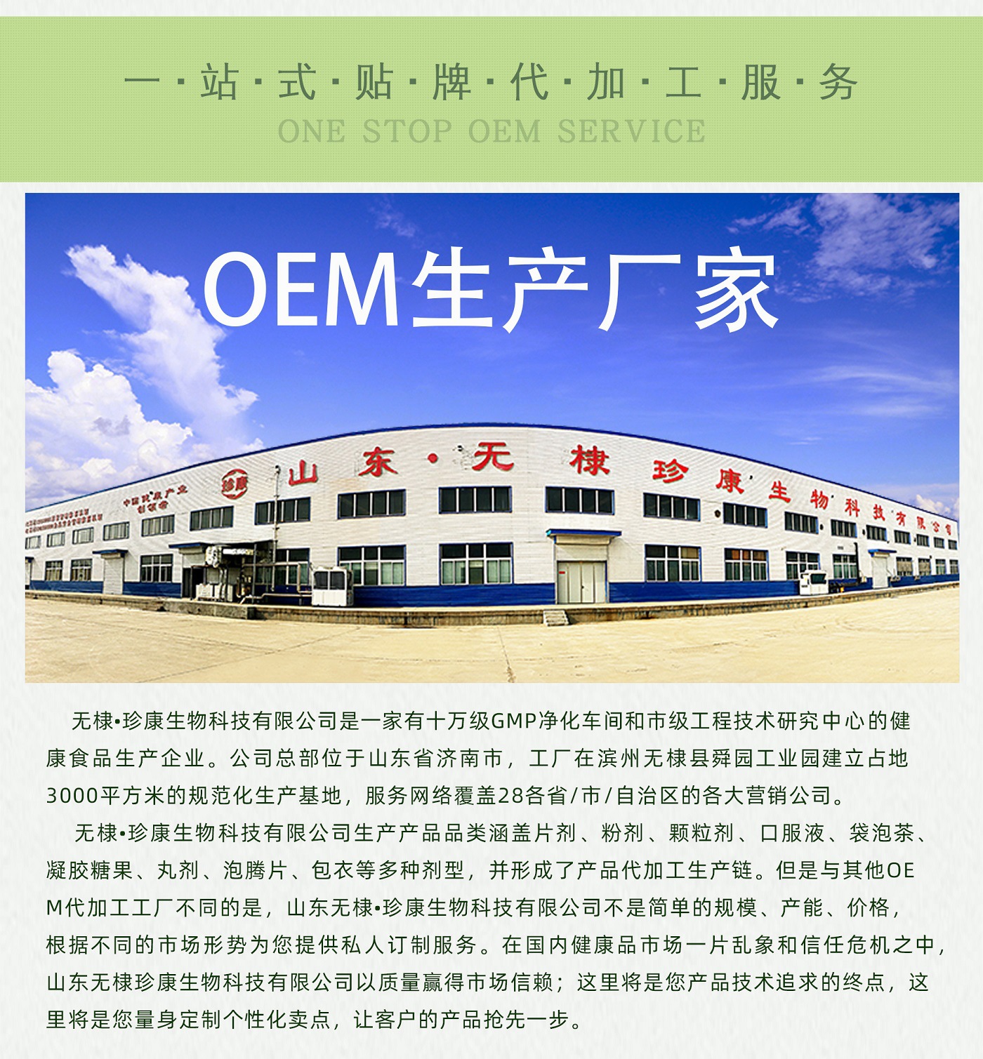 無棣珍康生物科技有限公司是一家有十萬級GMP凈化車間和市級工程技術(shù)研究中心的 健康食品生產(chǎn)企業(yè)。公司總部位于山東省濟(jì)南市,工廠在濱州無棣縣舜園工業(yè)園建立 占地3000平方米的規(guī)范化生產(chǎn)基地,服務(wù)網(wǎng)絡(luò)覆蓋28各省/市/自治區(qū)的各大營銷公司。 無棣?珍康生物科技有限公司生產(chǎn)產(chǎn)品品類涵蓋片劑、粉劑、顆粒劑、口服液、袋泡茶、 凝膠糖果、丸劑、泡騰片、包衣等多種劑型,并形成了產(chǎn)品代加工生產(chǎn)鏈。但是與其他 OEM代加工工廠不同的是,山東無棣?珍康生物科技有限公司不是簡單的規(guī)模、產(chǎn)能、 價(jià)格,根據(jù)不同的市場形勢為您提供私人訂制服務(wù)。在國內(nèi)健康品市場一片亂象和信 任危機(jī)之中,山東無棣珍康生物科技有限公司以質(zhì)量贏得市場信賴;這里將是您產(chǎn)品技 術(shù)追求的終點(diǎn),這里將是您量身定制個(gè)性化賣點(diǎn),讓客戶的產(chǎn)品搶先一步。