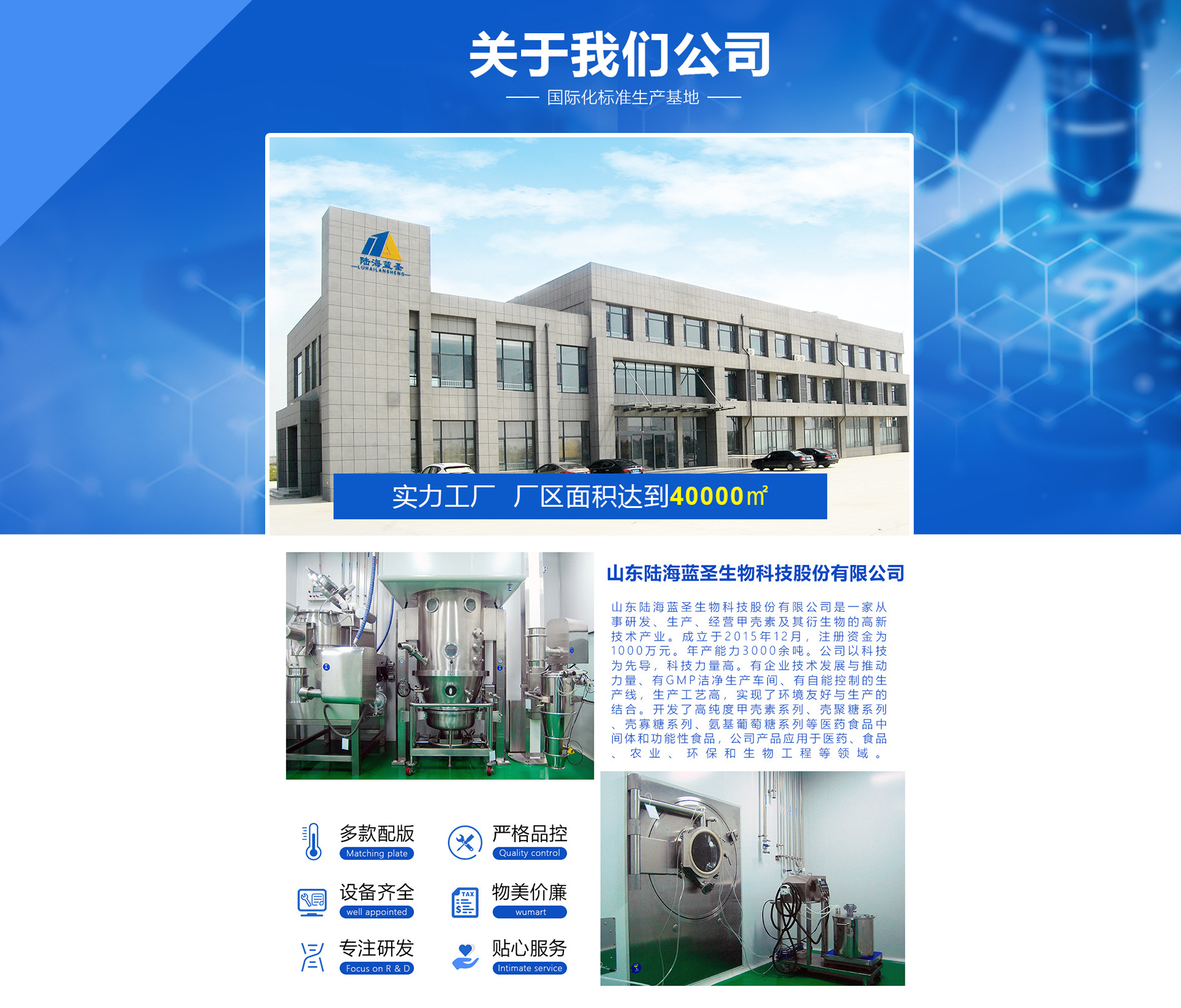 山東陸海藍(lán)圣生物科技股份有限公司,位于中國黃河入??谌侵薜闹行某鞘?東營市,注冊資金2億2千萬元整,是一家從事研發(fā)、生產(chǎn)、加工、銷售于一體的生物高新技術(shù)產(chǎn)業(yè),擁有10萬級無塵凈化車間,生產(chǎn)線涵蓋粉劑、片劑、膠囊、固體飲料等多條生產(chǎn)線,覆蓋了國內(nèi)的第三終端、連鎖藥店、線上直播自媒體等多個(gè)銷售渠道,同時(shí)與上海東華大學(xué)等高等院校密切合作,為集團(tuán)提供政策、管理、營銷、研發(fā)的高端服務(wù)。