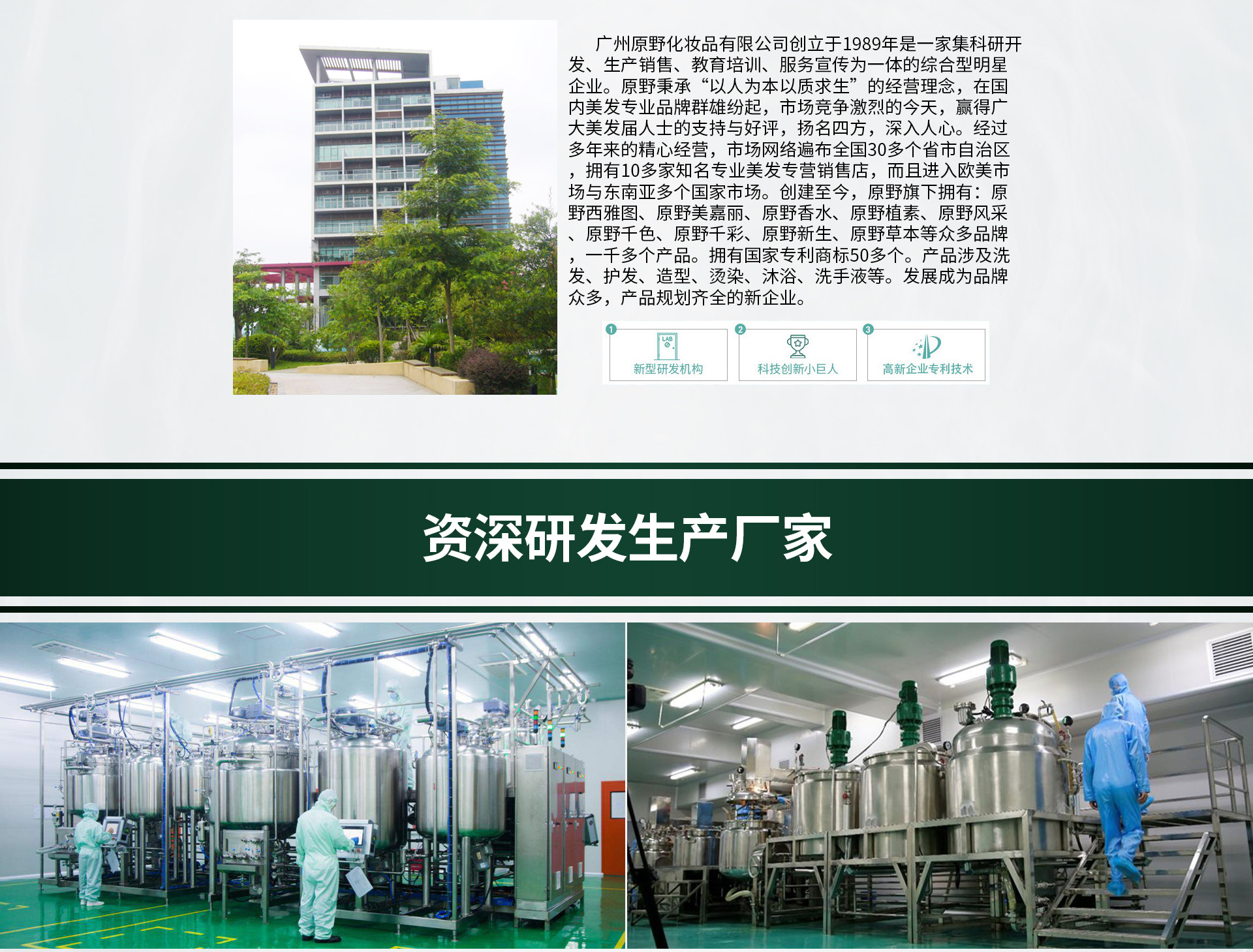 廣州原野化妝品有限公司創(chuàng)立于1989年,是一家集科研開發(fā)、生產(chǎn)銷售、教育培訓(xùn)、服務(wù)宣傳為一體的綜合性明星企業(yè)。從事專業(yè)美發(fā)行業(yè)發(fā)展,自創(chuàng)立以來,原野秉承“以人為本,以質(zhì)求存”的經(jīng)營理念。在當(dāng)今國內(nèi)美發(fā)專業(yè)品牌“群雄紛起”市場競爭激烈,消費(fèi)心理日益成熟的今天,“原野”贏得了廣大美發(fā)界人士和消費(fèi)者的認(rèn)可、支持與好評。 面對市場及行業(yè)發(fā)展的高低起伏,依然能穩(wěn)步前行。2015年公司精心研制原野沁香絲語精油系列、健康溫和PH 系列, 成功進(jìn)入商超渠道。兩年穩(wěn)入大潤發(fā),吉之島,天虹,永輝,嘉榮,人人樂,步步高,壹加壹,百佳,華潤萬家,天和,香江百貨,嘉惠連鎖,世紀(jì)華聯(lián)等商超系統(tǒng),約5000家商超門店。