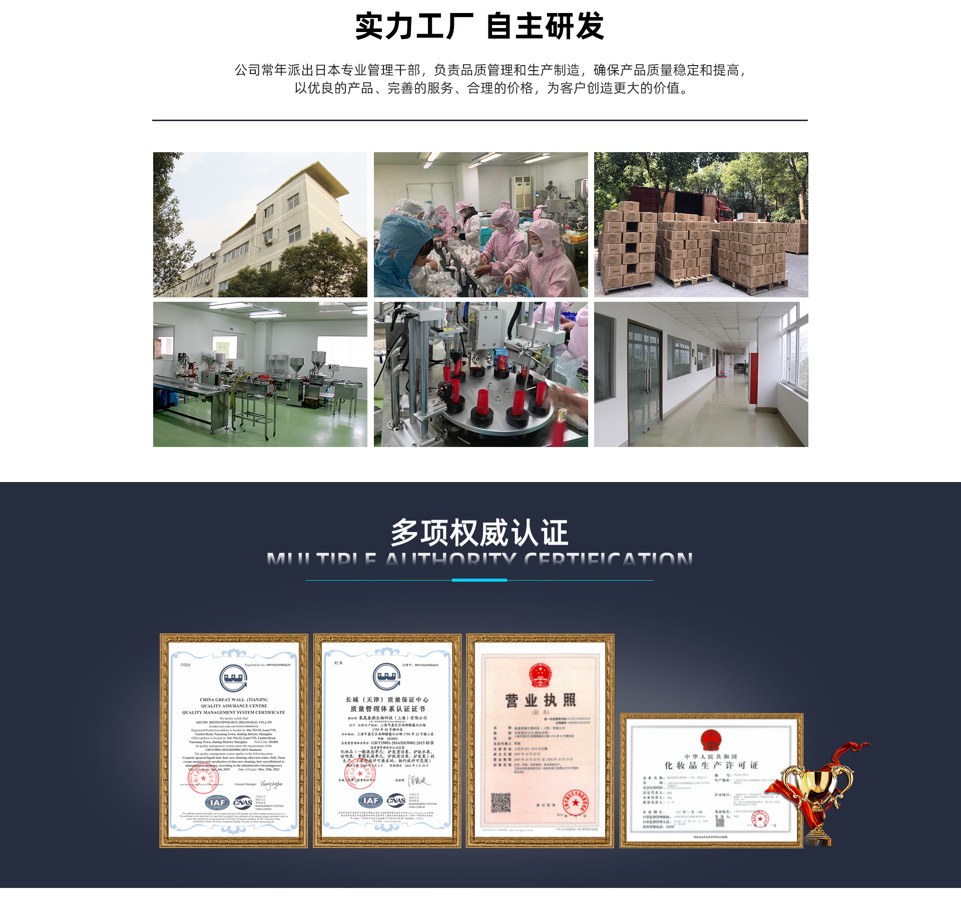 集晟春顏,專注于化妝品及相關(guān)產(chǎn)品服務(wù)的機(jī)構(gòu),致力于幫助人們實(shí)現(xiàn)內(nèi)外兼修的品質(zhì)生活而努力。 在中國: 2002年2月 在上海外高橋保稅區(qū)投資成立 恩庭國際貿(mào)易(上海)有限公司 2005年10月在上海嘉定區(qū)工業(yè)區(qū)設(shè)立制造工場(chǎng) 集晟春顏生物科技(上海)有限公司 集晟春顏生物科技(上海)有限公司,專注于護(hù)膚、發(fā)用、美容修飾、香水及相關(guān)精細(xì)化工產(chǎn)品的研究、開發(fā)和生產(chǎn)。公司擁有先進(jìn)的生產(chǎn)設(shè)備和技術(shù)研發(fā)能力,10萬級(jí)凈化潔凈生產(chǎn)車間,取得ISO質(zhì)量管理體系認(rèn)證,符合GMP管理標(biāo)準(zhǔn),擁有最新中華人民共和國《化妝品生產(chǎn)許可證》。 由日本公司常年派出日本專業(yè)管理干部,負(fù)責(zé)品質(zhì)管理和生產(chǎn)制造,確保產(chǎn)品質(zhì)量穩(wěn)定和提高,以優(yōu)質(zhì)的產(chǎn)品、完善的服務(wù)、合理的價(jià)格,為客戶創(chuàng)造更大的價(jià)值。 要贏得競(jìng)爭(zhēng),就要贏得消費(fèi)者和市場(chǎng)。集晟春顏堅(jiān)持“以人為本”的企業(yè)理念,不斷吸納各類技