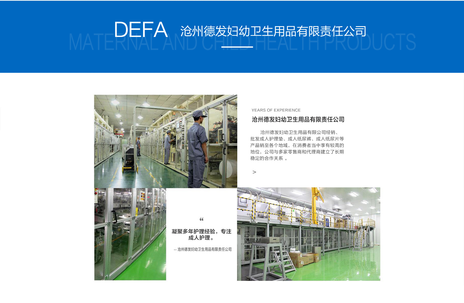 滄州德發(fā)婦幼衛(wèi)生用品有限責(zé)任公司是成人紙尿褲、成人紙尿片、成人護理墊等產(chǎn)品生產(chǎn)加工的公司。 隨著社會需求的不斷變化和公司經(jīng)營范圍的擴大,我們將在敬老愛老的工作中努力探索,全心全意為中老年服務(wù)事業(yè)的深入發(fā)展,通過經(jīng)營不斷創(chuàng)造社會價值。您的需求就是我們企業(yè)努力的方向!你的滿意就是評價我們企業(yè)工作的標(biāo)準(zhǔn)! 滄州德發(fā)婦幼衛(wèi)生用品有限責(zé)任公司的誠信和產(chǎn)品獲得業(yè)界的認(rèn)可。歡迎各界朋友蒞臨參觀、指導(dǎo)和業(yè)務(wù)洽談
