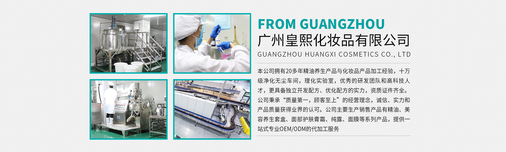 廣州市皇熙化妝品有限公司是一家集科研、開發(fā)、生產(chǎn)、銷售于一體的現(xiàn)代化綜合性化妝品集團(tuán)。專注于專業(yè)線、日化線OEM/ODM/OBM服務(wù),擁有專業(yè)的科研中心、生產(chǎn)中心、銷售中心和管理中心。公司以質(zhì)量為生命,建設(shè)擁有GMPC認(rèn)證和ISO9001質(zhì)量管理體系的10萬級凈化無塵生產(chǎn)車間和研發(fā)檢測中心,精選各地優(yōu)質(zhì)原料,采用超臨界萃取等前沿工藝和技術(shù),全自動包裝流水線,完善的質(zhì)量管理體系,保證優(yōu)質(zhì)的產(chǎn)品質(zhì)量和服務(wù)??杉庸どa(chǎn)單方精油、復(fù)方精油、優(yōu)質(zhì)基礎(chǔ)油、草本油、草本液、面膜、純露、基礎(chǔ)型護(hù)膚、功能型護(hù)膚等產(chǎn)品,根據(jù)客戶不同需求量身定制加工。 2016年7月15日,廣州市皇熙化妝品有限公司在深圳前海新四板成功掛牌,掛牌代碼:668157。2017年3月8日在香港獲批通過全球中小企業(yè)股權(quán)交易中心直通車掛牌,掛牌代碼:91214。迎來企業(yè)發(fā)展史上的里程碑。
