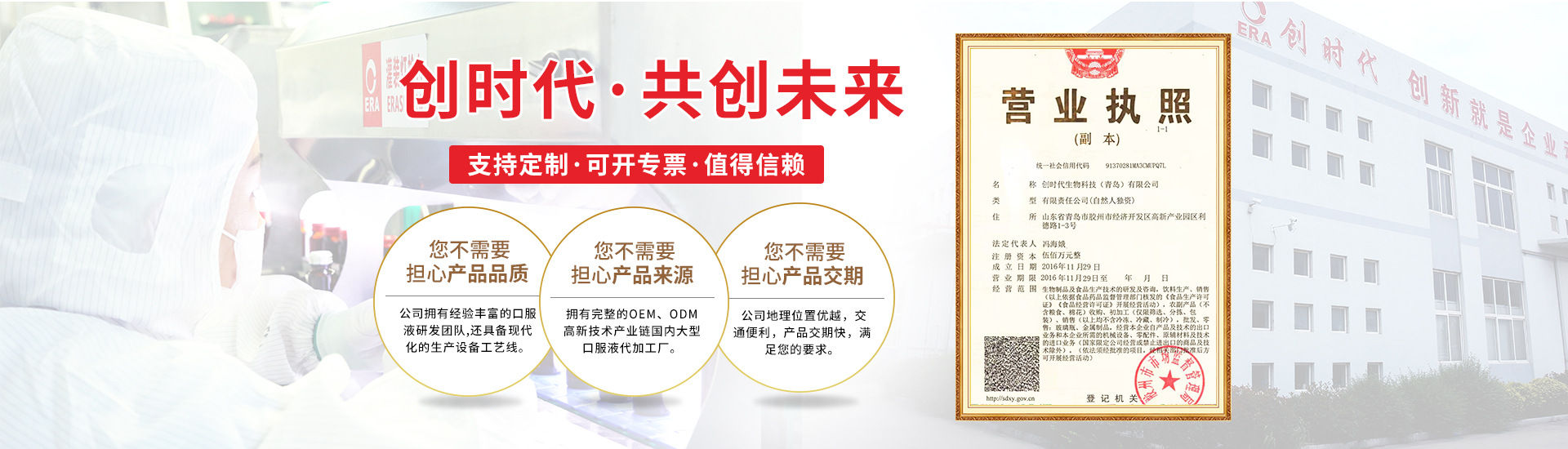 創(chuàng)時代生物科技(青島)有限公司是時代(中國)集團有限公司的青島子公司,2018年8月,由時代(中國)集團有限公司通過出資收購成立。公司對原有生產(chǎn)線進行了改造升級,并新增自動化生產(chǎn)線一條,使原有產(chǎn)能增加兩倍。集團公司將以現(xiàn)有基礎(chǔ)為跳板,三年內(nèi)建成北方地區(qū)的研發(fā)、生產(chǎn)基地,以便利北方市場的開拓、發(fā)展,形成南有時代生物科技(深圳)有限公司,北有創(chuàng)時代生物科技(青島)有限公司的南、北布局。
