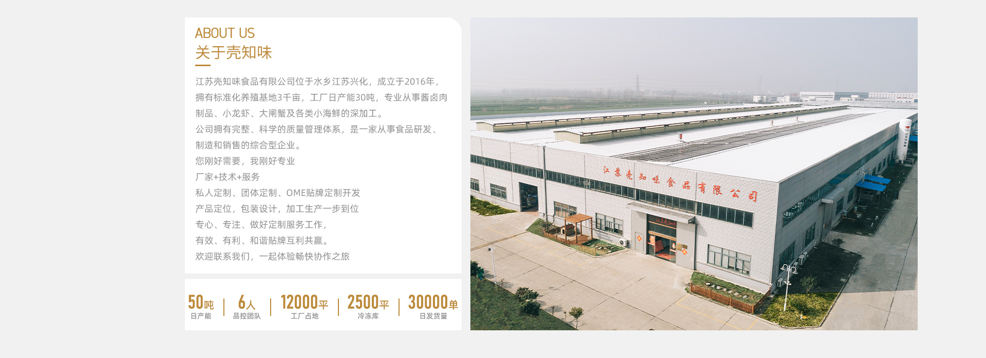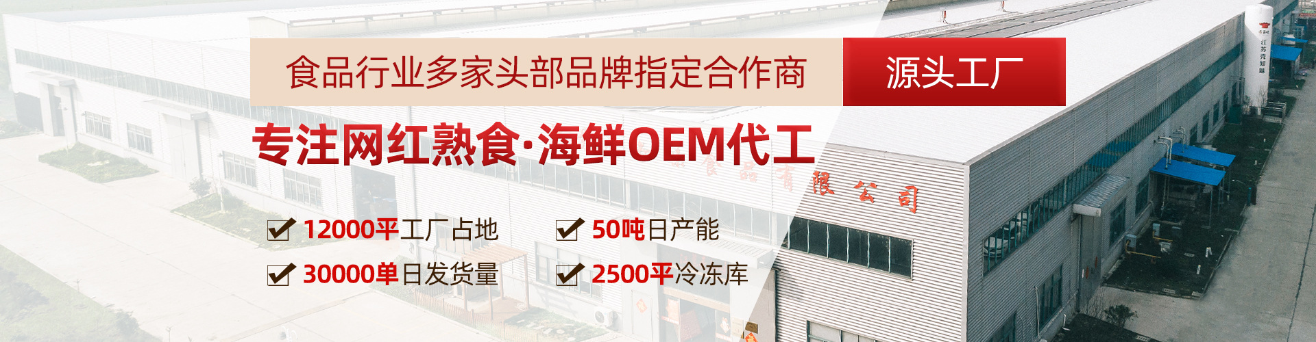 專注貼牌代工及一件代發(fā)網(wǎng)紅食品的工廠 一、工廠生產(chǎn)資質(zhì): 1、肉制品:如網(wǎng)紅虎皮鳳爪、網(wǎng)紅脫骨鳳爪、黑鴨風味鴨類食品等全系列醬鹵肉制品。 2、速凍調(diào)制食品: (1)生制品(調(diào)味水產(chǎn)制品、菜肴制品) (2)熟制品(調(diào)味水產(chǎn)制品、菜肴制品) 3、調(diào)味品(水產(chǎn)調(diào)味料):蟹黃醬及各類海鮮醬。 4、水產(chǎn)制品(熟制水產(chǎn)品):水產(chǎn)系列制品。 二、產(chǎn)品能力: 1、通過國內(nèi)、國際各項體系認證,擁有完整的品控體系; 2、具有獨立開發(fā)新品、研發(fā)口味及轉(zhuǎn)化成工業(yè)化生產(chǎn)的能力。 三、產(chǎn)能及發(fā)貨能力: 1、工廠占地1.2萬平方米,生產(chǎn)車間面積0.6萬平方米,自有冷凍庫面積0.2萬平方米; 2、設備投資約4000萬元,日產(chǎn)量50噸; 3、日發(fā)貨能力3萬單。 我司將懷著:“開放、進取、積極、包容”的心態(tài),歡迎您前來參觀指導、合作洽談。