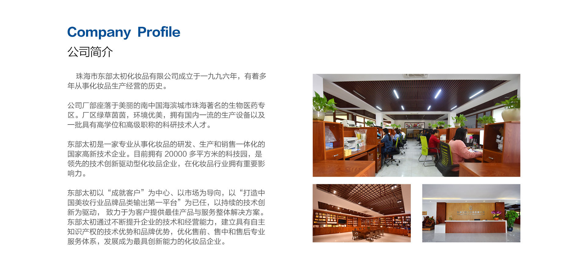 珠海市東部太初化妝品有眼公司成立于1996年,是一家專業(yè)從事化妝品的科研、開(kāi)發(fā)、生產(chǎn)、營(yíng)銷服務(wù)、文化教育 為一體化的國(guó)家高新技術(shù)企業(yè)。目前擁有20000多平方米的科技園,是領(lǐng)先的技術(shù)創(chuàng)新驅(qū)動(dòng)型化妝品企業(yè),在化妝 品行業(yè)擁有重要影響力。公司廠部座落于美麗的南中國(guó)海濱城市珠海著名的生物醫(yī)藥專區(qū),廠區(qū)綠草茵茵,環(huán)境優(yōu) 美,擁有國(guó)內(nèi)一流的生產(chǎn)設(shè)備以及一批具有高學(xué)位和高級(jí)職稱的科研技術(shù)人才,創(chuàng)新核心JDM —體化參與性品牌 深度戰(zhàn)略合伙人模式(聯(lián)合設(shè)計(jì)制造)更是打破了護(hù)膚代工行業(yè)的壁壘,更好、更緊密、更貼近市場(chǎng)與客戶所需注 重技術(shù)研發(fā)和創(chuàng)意團(tuán)隊(duì)建設(shè),致力于全球資源整合,如合作品牌、專業(yè)研發(fā)機(jī)梅、優(yōu)秀的策劃設(shè)計(jì)團(tuán)隊(duì)。集團(tuán)旗下 有3家子公司、享譽(yù)國(guó)際一韓國(guó)蘭芝(丹迪蘭)品牌:野蠻生態(tài)聚商系統(tǒng)就是由馨鮮生物科技有限公司主要負(fù)責(zé)運(yùn)營(yíng), 通過(guò)三大平臺(tái);四大臺(tái)階;6個(gè)聚商圈;讓整個(gè)美容行業(yè)回歸行業(yè)初心。
