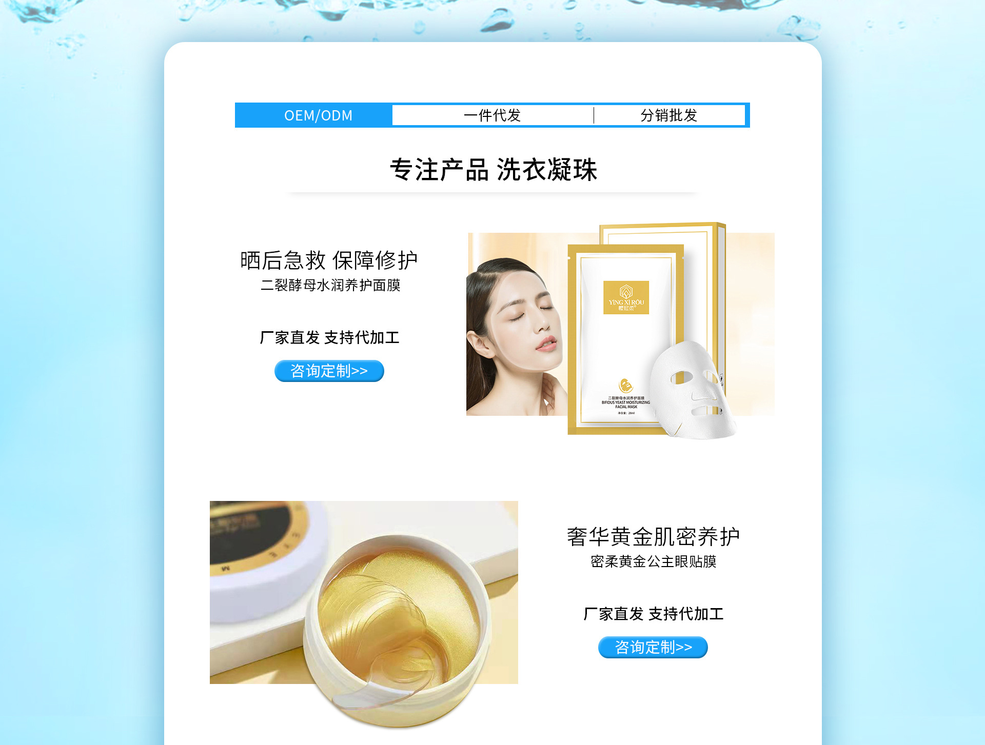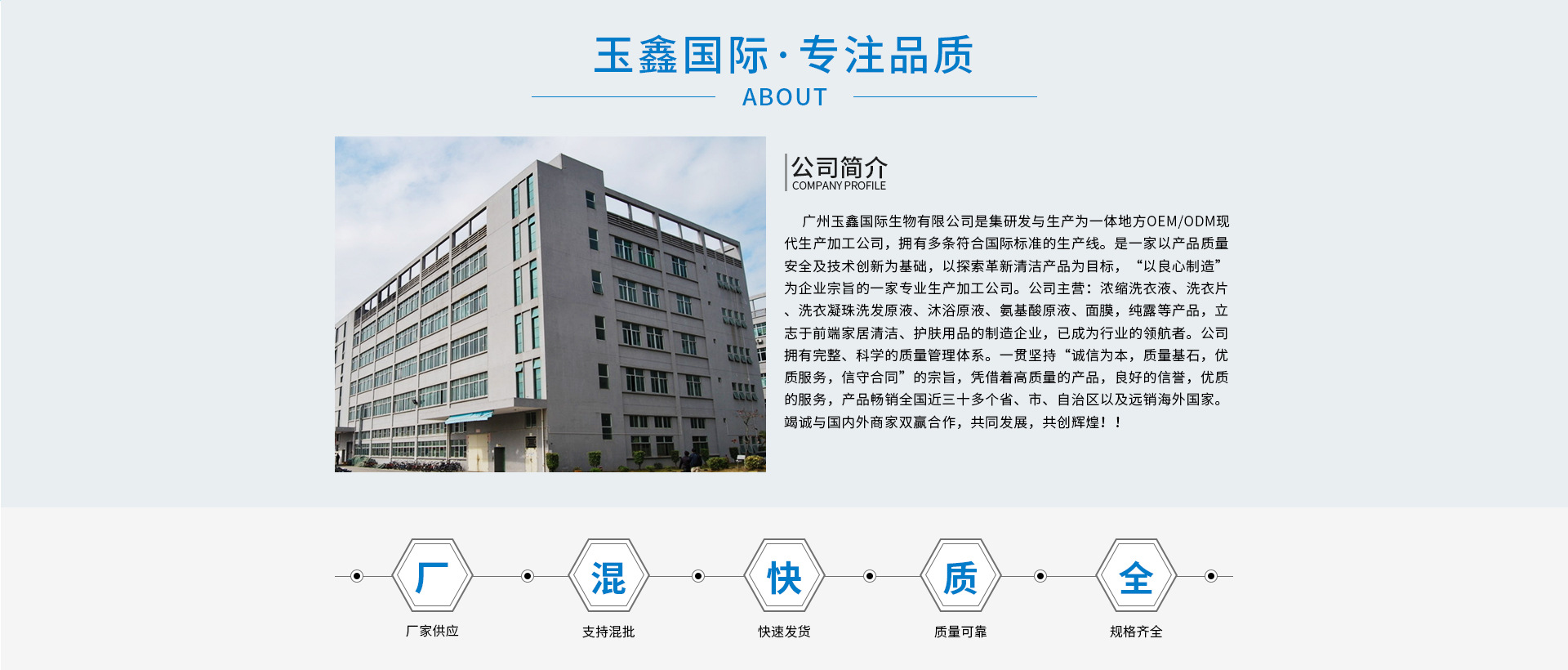 行業(yè)領(lǐng)導(dǎo)者 因為專注 所以專業(yè) 玉鑫國際(珠海)有限公司作為玉鑫國際的下屬生產(chǎn)企業(yè),以生產(chǎn)洗衣片洗,洗衣凝珠,潔面紙,蜂漿紙,,專業(yè)線功效性套盒,面膜,洗發(fā)水,沐浴露等化妝品種類OEM加工領(lǐng)導(dǎo)企業(yè),玉鑫國際秉承 “專注品質(zhì) 良心制造”的價值理念,堅持為客戶創(chuàng)造價值,為員工創(chuàng)造機會,為投資者創(chuàng)造回報,為社會創(chuàng)造財富。 玉鑫國際的口號是“因為專注 所以專業(yè)”,為客戶提供優(yōu)質(zhì)的產(chǎn)品與服務(wù),是玉鑫國際發(fā)展的基石,更是生存的意義。 專業(yè)的研究中心 由中外資深研發(fā)專家組成的億通研發(fā)中心,與國際、國內(nèi)一流的知名化妝品企業(yè)展開長期的技術(shù)合作,研發(fā)實力位居國內(nèi)化妝品用品的前列。 優(yōu)質(zhì)專業(yè)的 OEM / ODM / OBM 加工業(yè)務(wù)